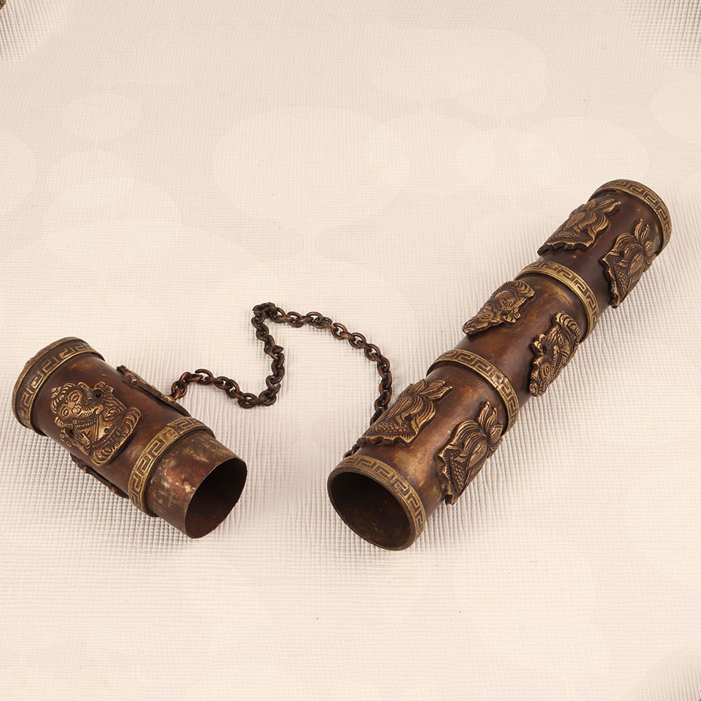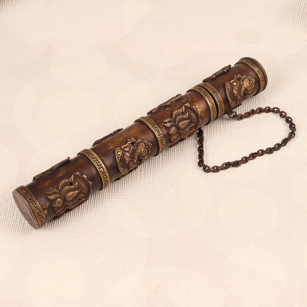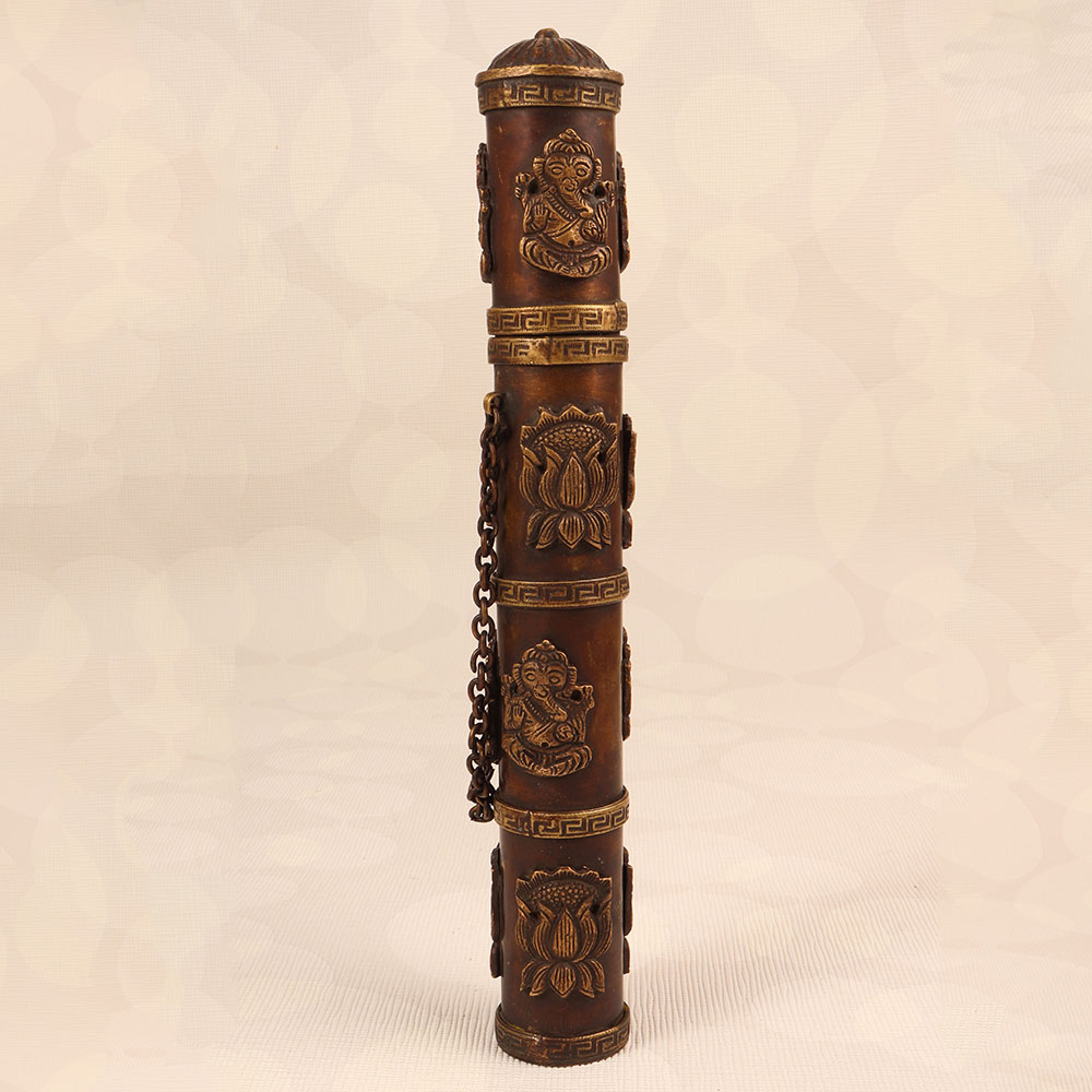 Buy a Brass Copper Incense Case online that is a magnificent piece of functional art meticulously crafted by skilled Tibetan artisans. Fashioned from high-quality brass and copper, this incense case boasts an exquisite antique brown finish that adds a touch of timeless elegance to any space. The case is adorned with intricate engravings of Lord Ganesha, the revered deity symbolizing wisdom and prosperity, and delicate Lotus carvings, representing purity and enlightenment. These artistic details not only elevate the aesthetic appeal but also infuse a spiritual aura, making it a perfect addition to prayer rooms at home, offices, restaurants, hotels, or cafes. Handmade with precision, each incense case is a testament to the artisan's dedication to preserving the rich heritage of Tibetan Art. Beyond its functional purpose of holding incense sticks, this case serves as a striking decor piece, enhancing the ambiance of any environment. Ideal for special, festive, or auspicious occasions, the Brass Copper Incense Case makes for a thoughtful and meaningful gift. Its cultural significance, combined with meticulous craftsmanship, ensures a cherished and enduring token for your loved ones.