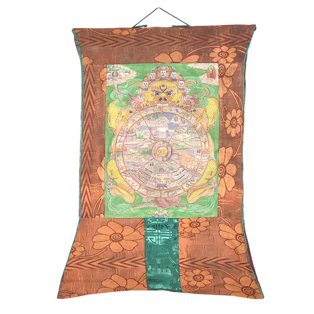 The wheel of life thangka is considered an endless life cycle of human being. It is believed to have been drawn first by the Buddha himself As seen in the picture, a minister demon, usually identified as Yama the god of death, clutches the whole wheel.