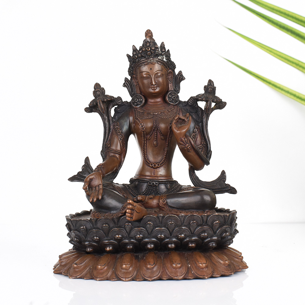 Elevate your meditation practice with the captivating presence of the Tibetan Goddess Tara. This exquisite copper statue, crafted with time-honored artistry, beckons you to a realm of serenity and divine connection. The Goddess Tara is a beloved figure in Tibetan Buddhism, known as the "Mother of Liberation" and the embodiment of compassion. This stunning copper statue invites you to cultivate your own compassion, wisdom, and inner peace. As you gaze upon her serene expression, allow her calming presence to wash over you, guiding you towards a deeper connection with the divine. Whether you're an experienced practitioner or new to the world of meditation and spirituality, this Tibetan Art Goddess Tara statue will become a cherished companion on your journey of self-discovery. Display it prominently in your prayer room or meditation space, and let its timeless beauty inspire you to embrace the transformative power of mindfulness and devotion.