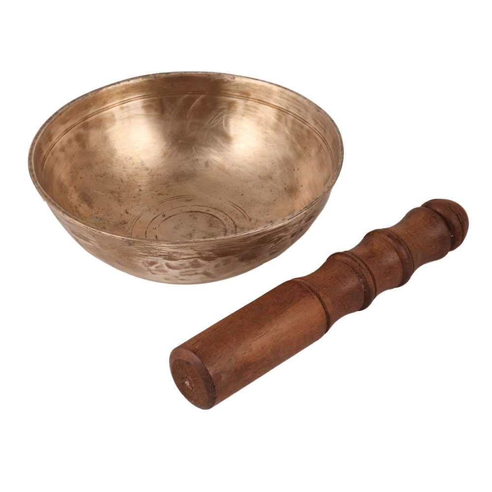 Discover the power of sound healing with this Om singing bowl and wooden mallet set. The bowl's harmonic tones and the rhythmic vibrations it produces are known to promote relaxation, stress relief, and focus during meditation. Handcrafted with attention to detail, this beautiful bowl features antique finish, making it a meaningful and thoughtful gift for family, friends and relatives ones on special and festive occasions who value their well-being and spiritual practices. Add this incredible bowl in your vintage art collection. It is made by local Indian artisans from high quality bell metal with their hands that leaves a long lasting impression to the decoration.