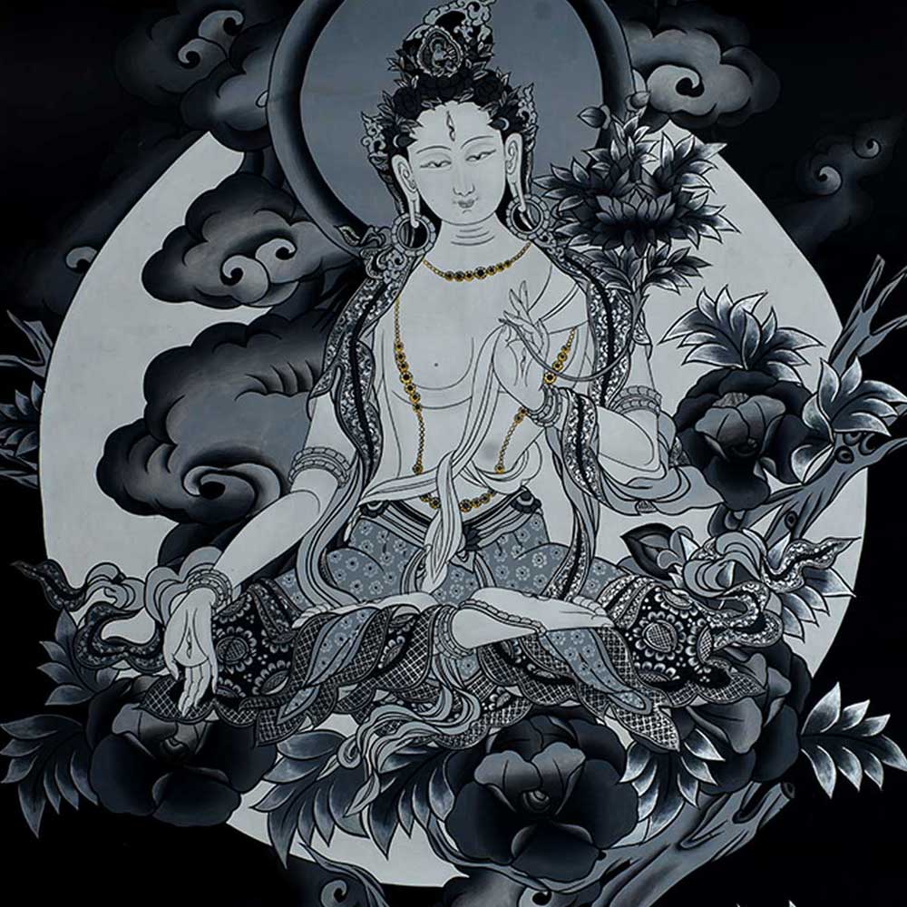 Tara is the female counterpart of Avalokiteshvara, the Buddhist Bodhisattva of Compassion (Lokeshwor). Avalokiteshwora is also referred to as Varochana's consort. She is frequently depicted as a Boddhisattwas, seated, dressed, and crowned. She is seated in full vajra posture, her left hand clutching the stem of the lotus in a guidance posture. White Tara is a Buddhist practise that aids in life extension and healing.