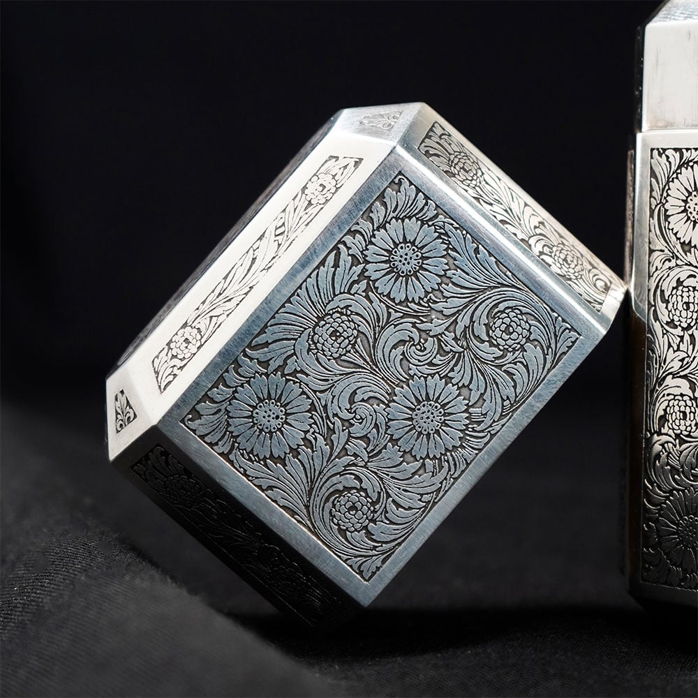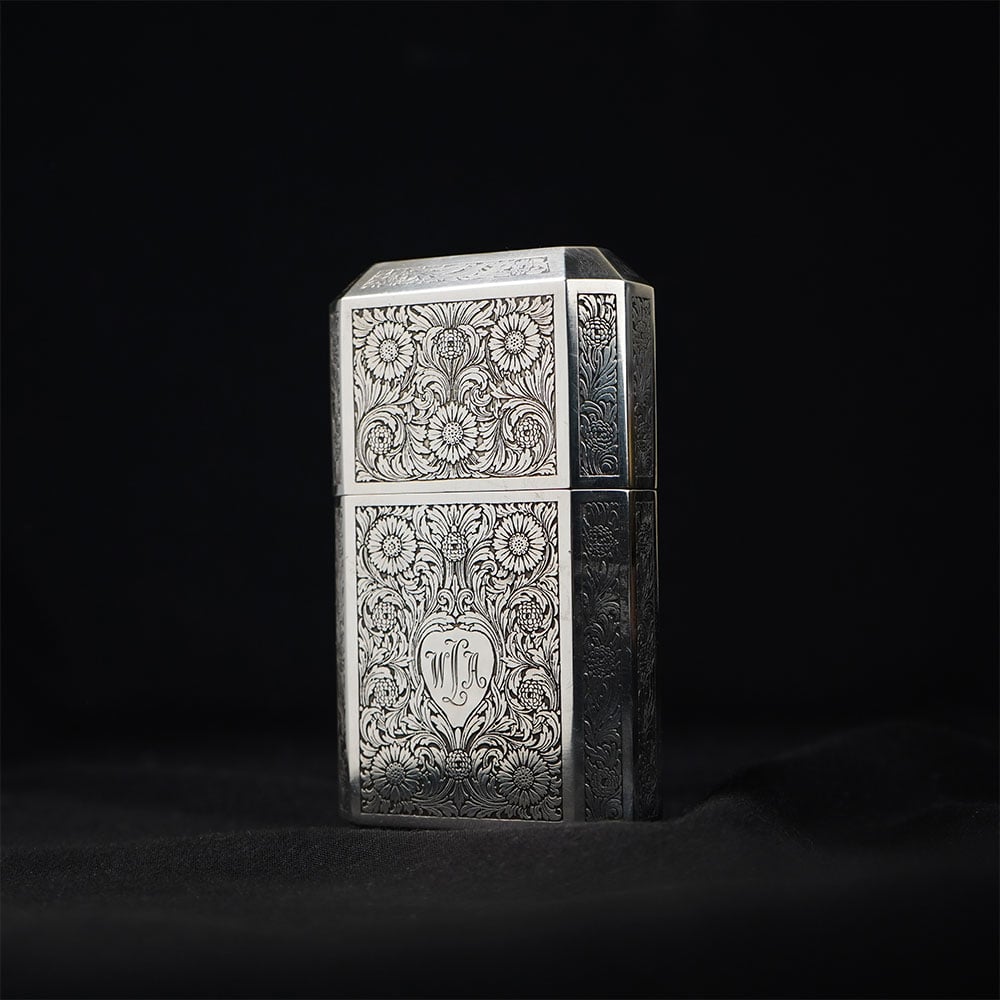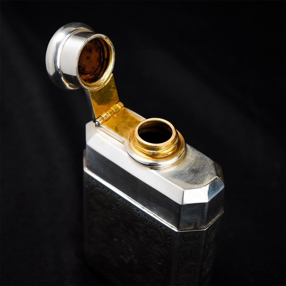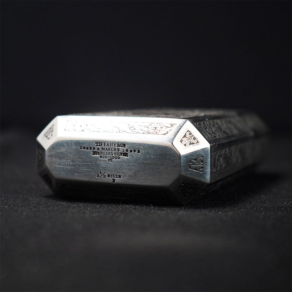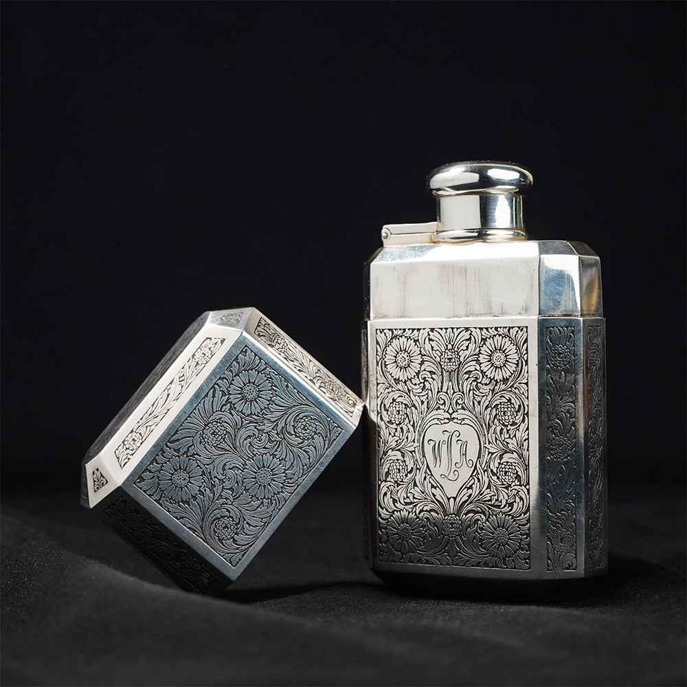 This TIFFANY AND CO. sterling silver engraved flask is an elegant example of refined silver craftsmanship, combining functional design with intricate ornamental engraving. The flask features a structured geometric silhouette with multiple panels, each decorated with finely detailed floral and scroll patterns that create a rich textured surface typical of classic TIFFANY AND CO. sterling silver pieces. At the center of the main panel sits a shield-shaped cartouche bearing a monogram, surrounded by elaborate floral engraving. This decorative arrangement reflects traditional European metalwork styles often used in luxury silver accessories and collectible personal objects. The flask is fitted with a hinged cap that opens smoothly to reveal the interior chamber. The inside is finished with a gold-toned lining, a traditional technique used in high-end silverware to help preserve liquids while protecting the sterling silver interior. The secure hinged lid maintains the sleek and balanced form of the piece when closed. The polished sterling silver surface beautifully highlights the engraved patterns, creating a striking contrast between the reflective metal and the deep decorative detailing. Ideal for collectors of fine silverware, Tiffany enthusiasts, or decorative luxury objects, this TIFFANY AND CO. sterling silver flask represents timeless craftsmanship and sophisticated design.