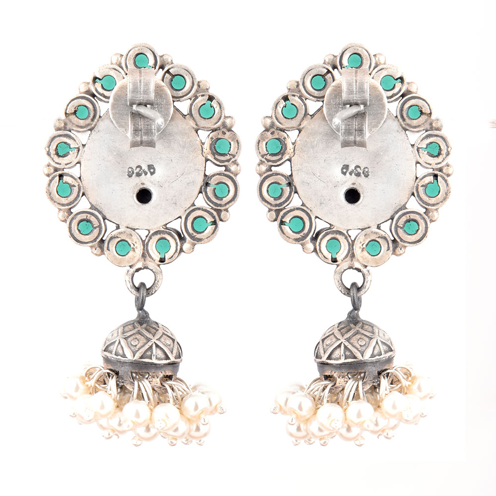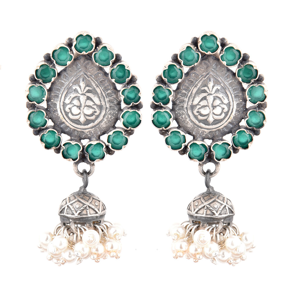 Traditional 92.5 Sterling Silver Earrings Fancy Designer Green Onyx Stone Oxidized Jhumki Earrings