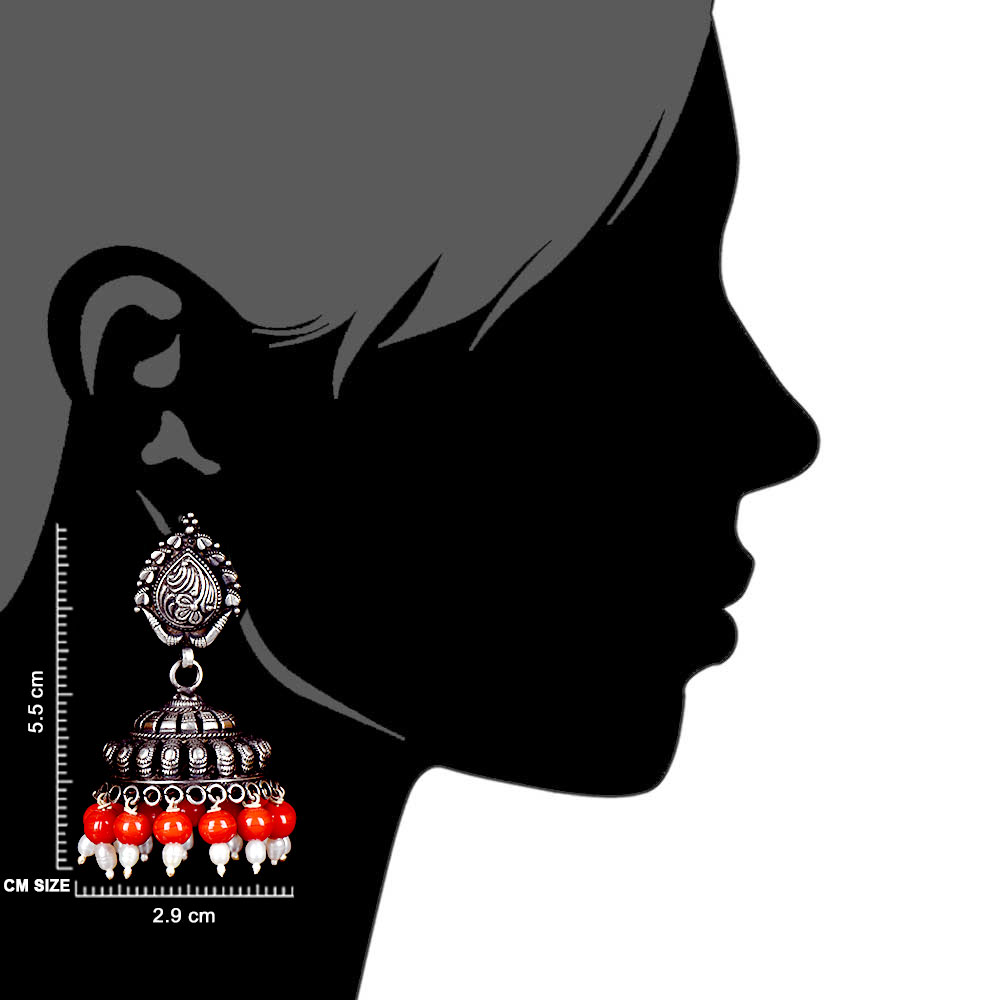 • Traditional 92.5 Sterling Silver Earrings  Intricate Carved Jhumkis With Coral And Pearls