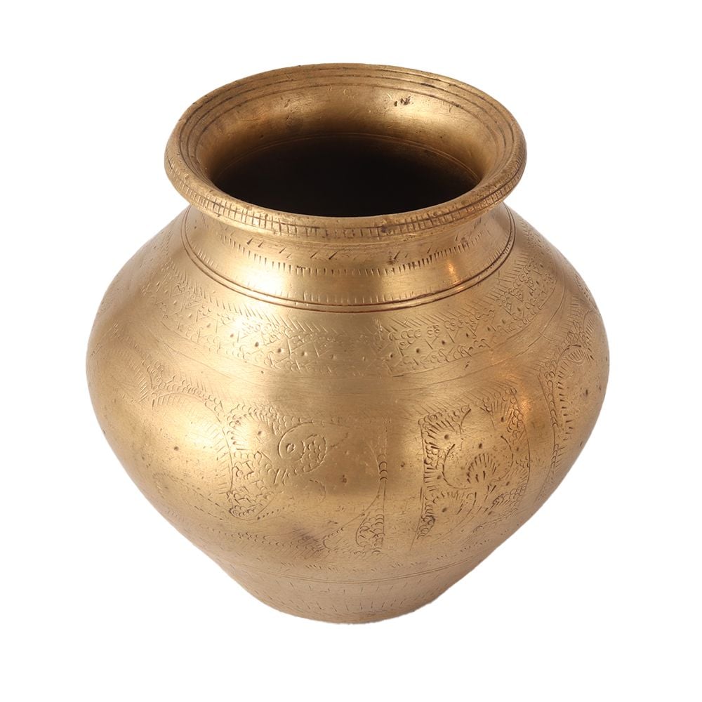Add a charming look to your decor with an engraved brass pitcher. Handcrafted by Indian artisans using ancient methods, this antique brass pot will be a real eye-catcher for your guests. It is engraved with beautiful floral motifs and peacock patterns. Since brass keeps water fresh and has many health benefits, this vintage brass pot has been used as a drinking water pot in Indian households. As it is used, we recommend using this pot for decoration. Place it on the table, desk or altar as an indoor flower pot to spread positive energy in the environment. Nowadays, it is a trendy item for home and office decoration to give a seductive look to the interiors. A perfect gift for any festive and auspicious occasion for your loved ones.