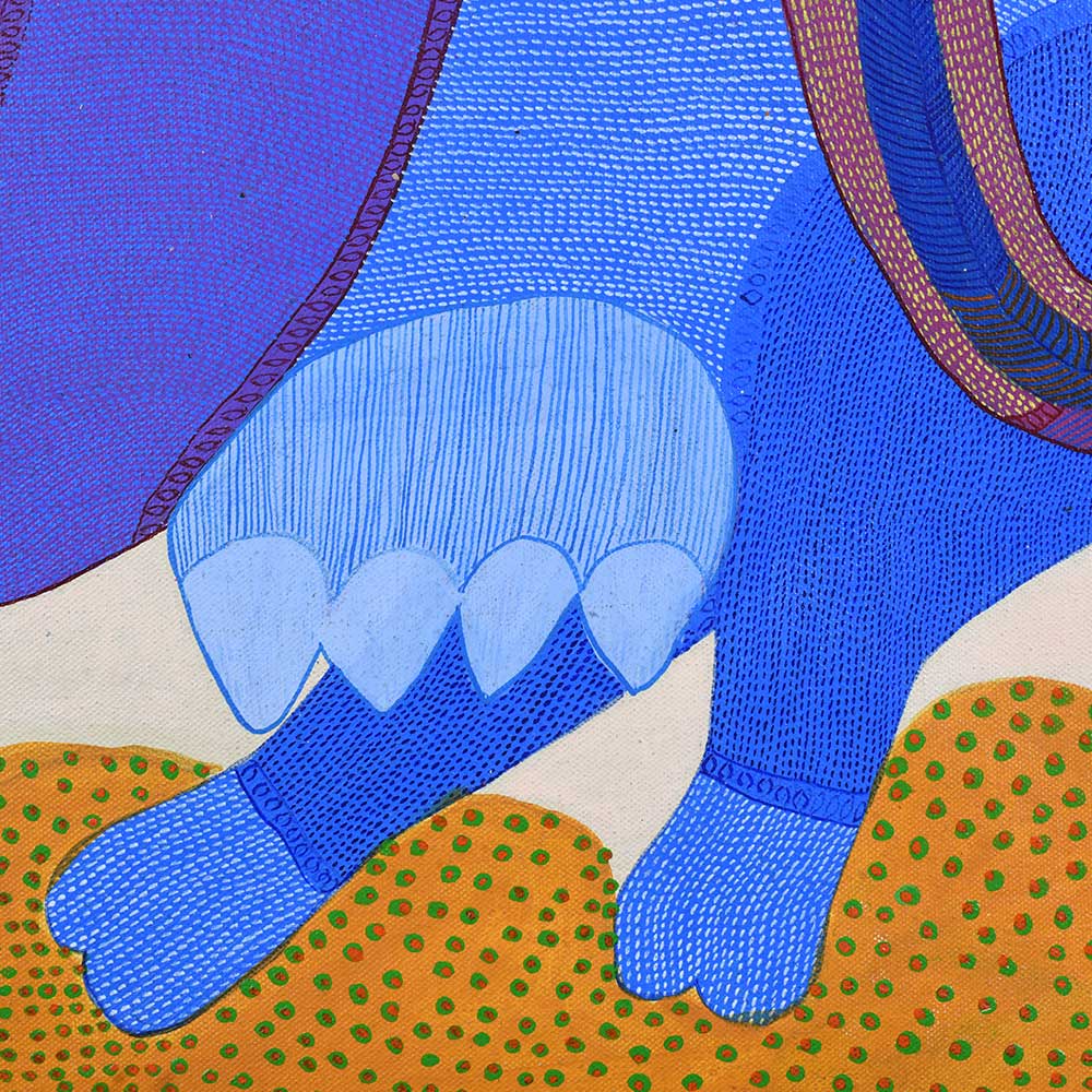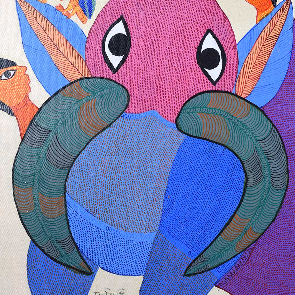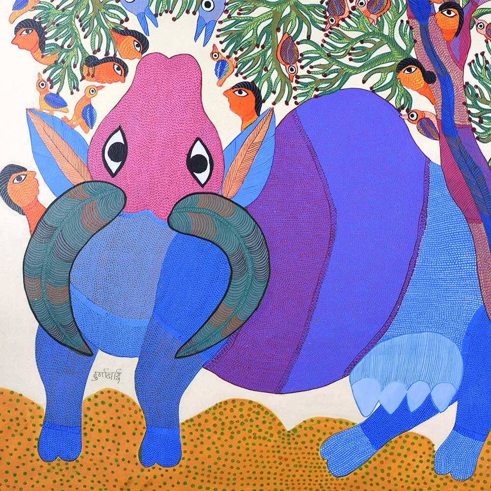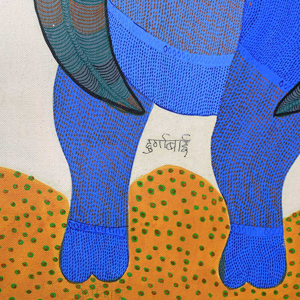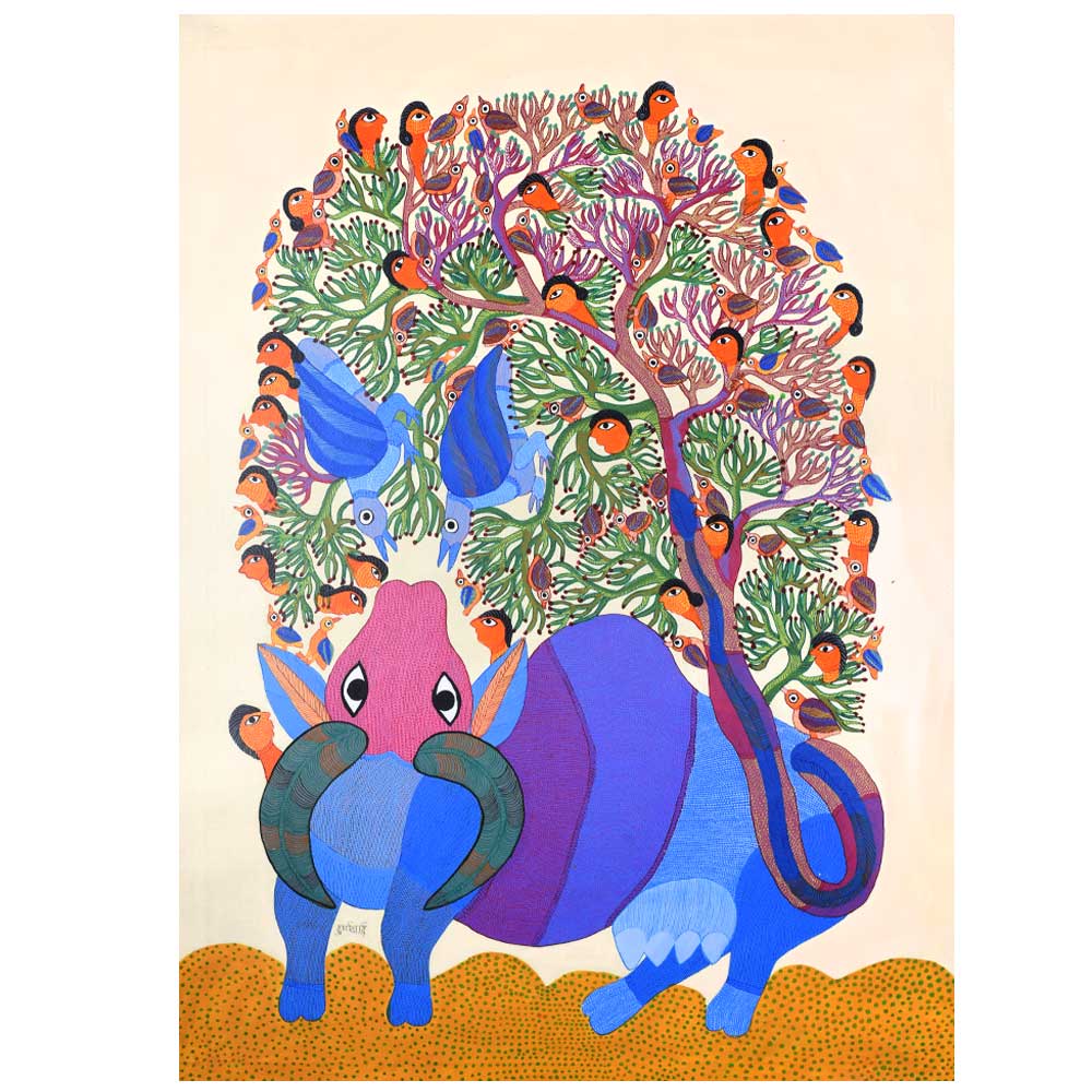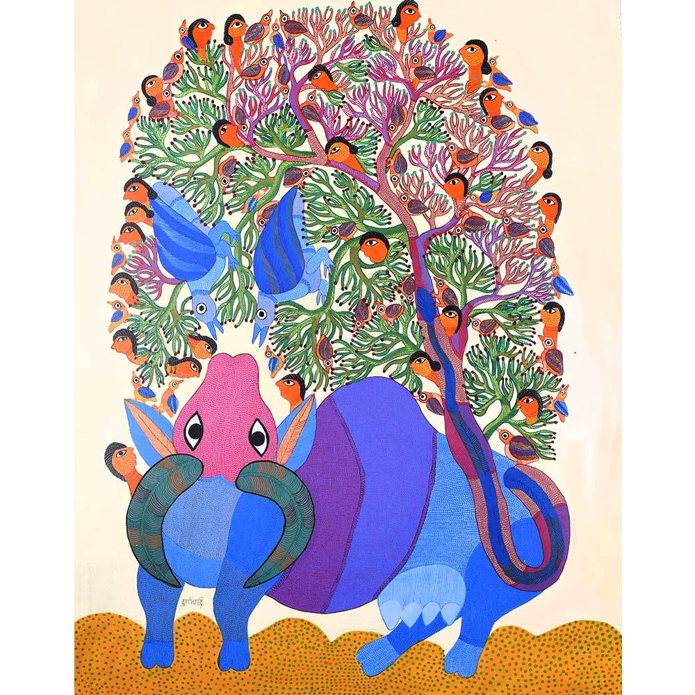 Durgabai Vyam, a renowned Gond artist, was honored with the Padma Shri in 2022 for her exceptional contributions to the traditional art form of Gond painting without frame. Hailing from the Gond tribe in Madhya Pradesh, her works are an intricate blend of symbolism, cultural heritage, and vibrant colors. Through her paintings, she brings to life the stories and myths of her community, preserving the rich folklore of the Gond people for future generations. This acrylic painting on paper by Durgabai Vyam showcases her signature style, which is deeply rooted in nature and spirituality. The painting features a harmonious blend of animal motifs, and geometric patterns. Durgabai’s use of vivid colors, intricate dotting, and dynamic forms conveys a sense of movement and energy. The composition feels alive, with animals and elements of the natural world appearing to leap off the paper. Each symbol in the artwork represents an aspect of Gond mythology, evoking a deep connection to the environment and the spirit world.