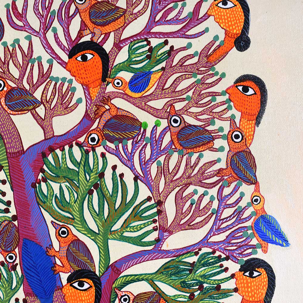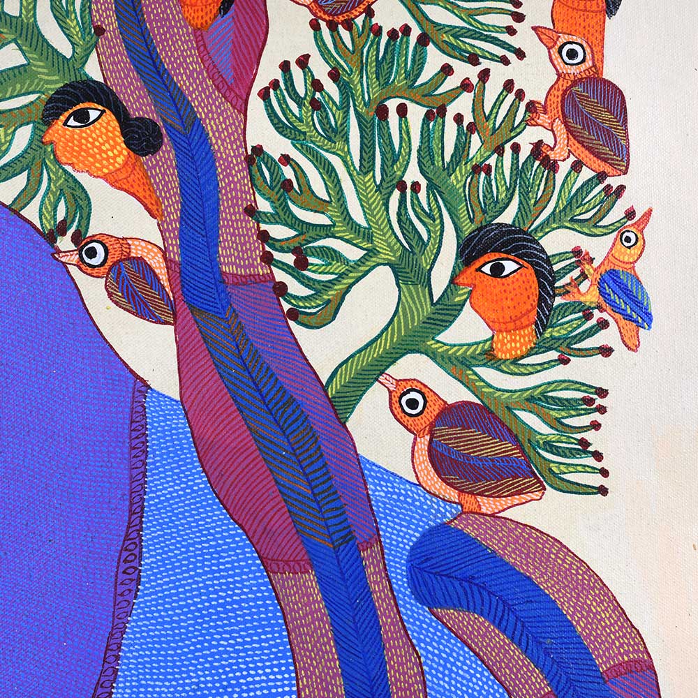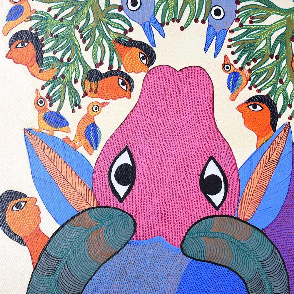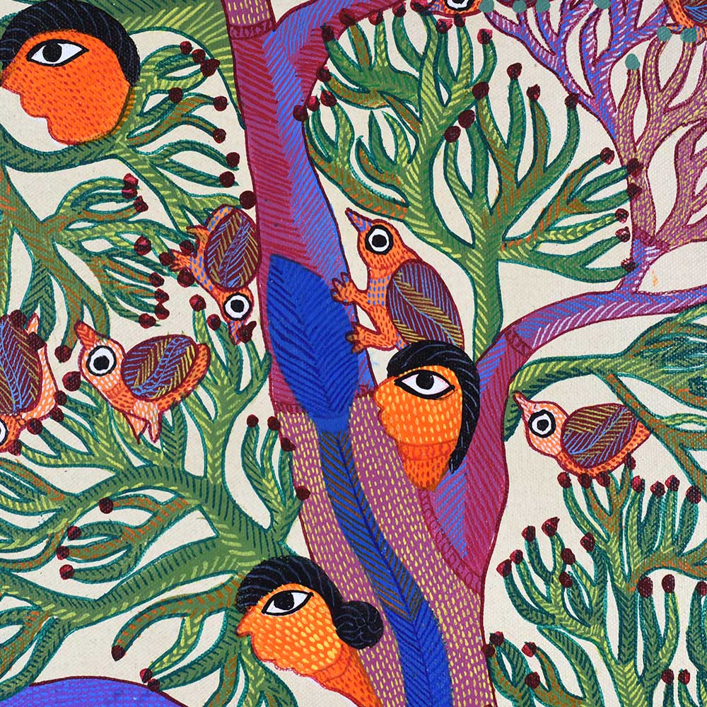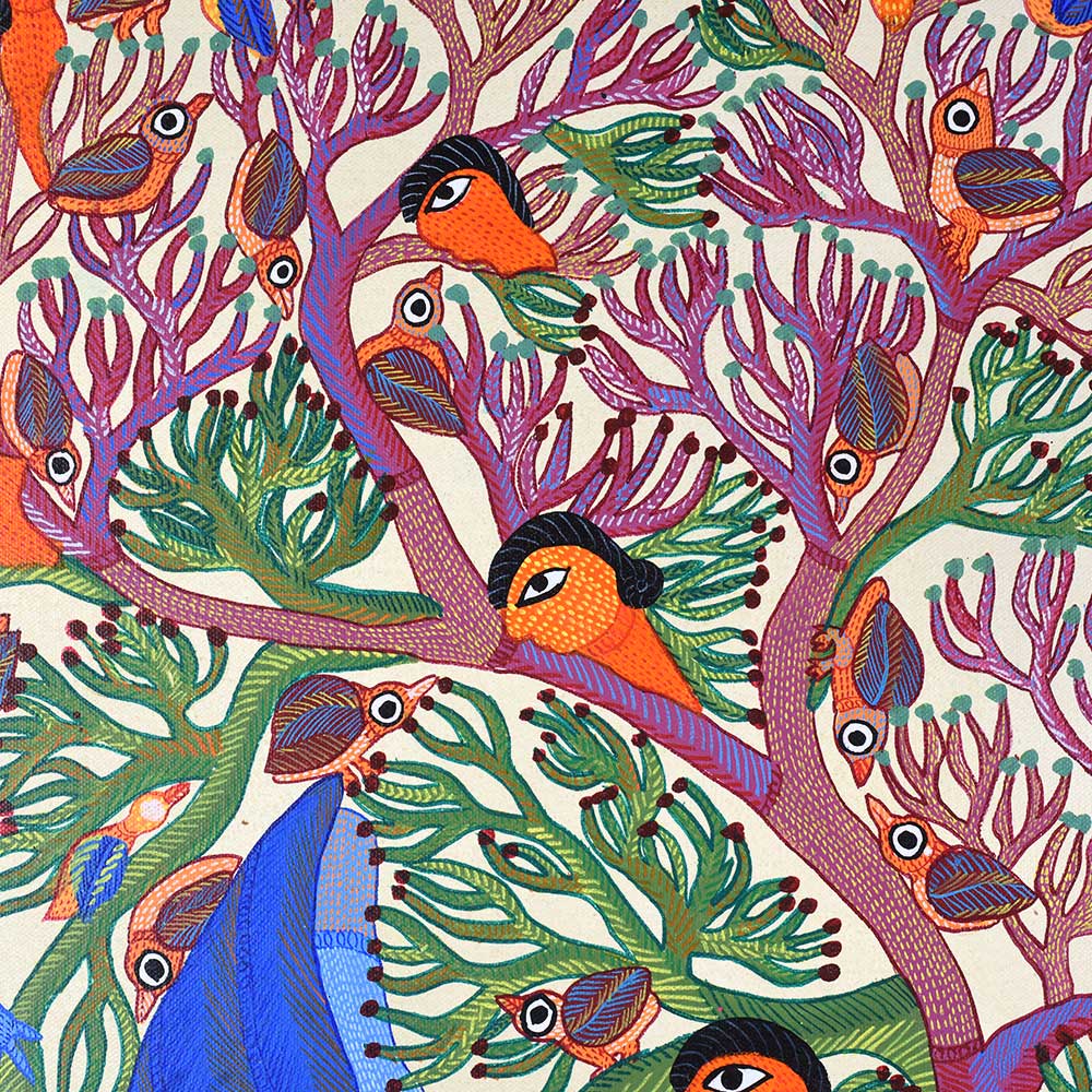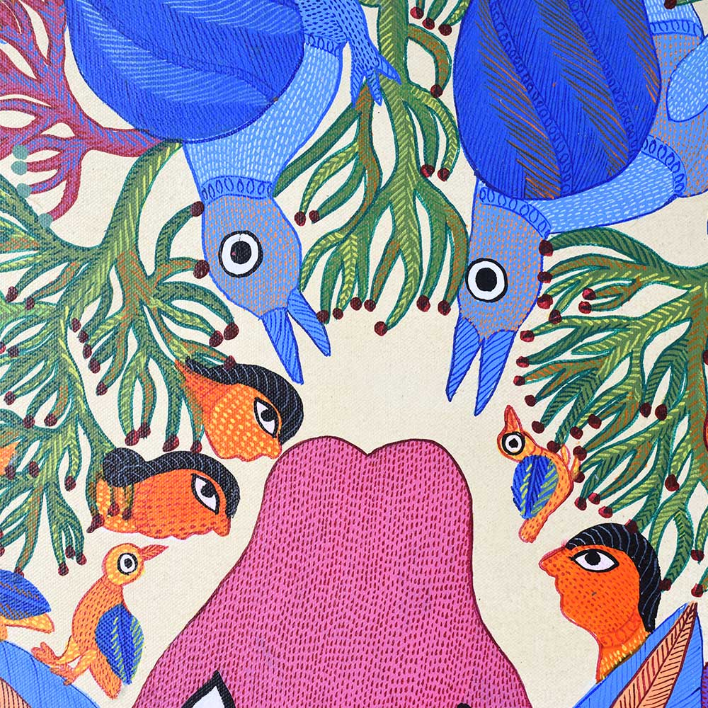 - Acrylic on canvas: Durgabai’s expert use of acrylic paints enhances the vivid colors and texture of the work, bringing the piece to life.