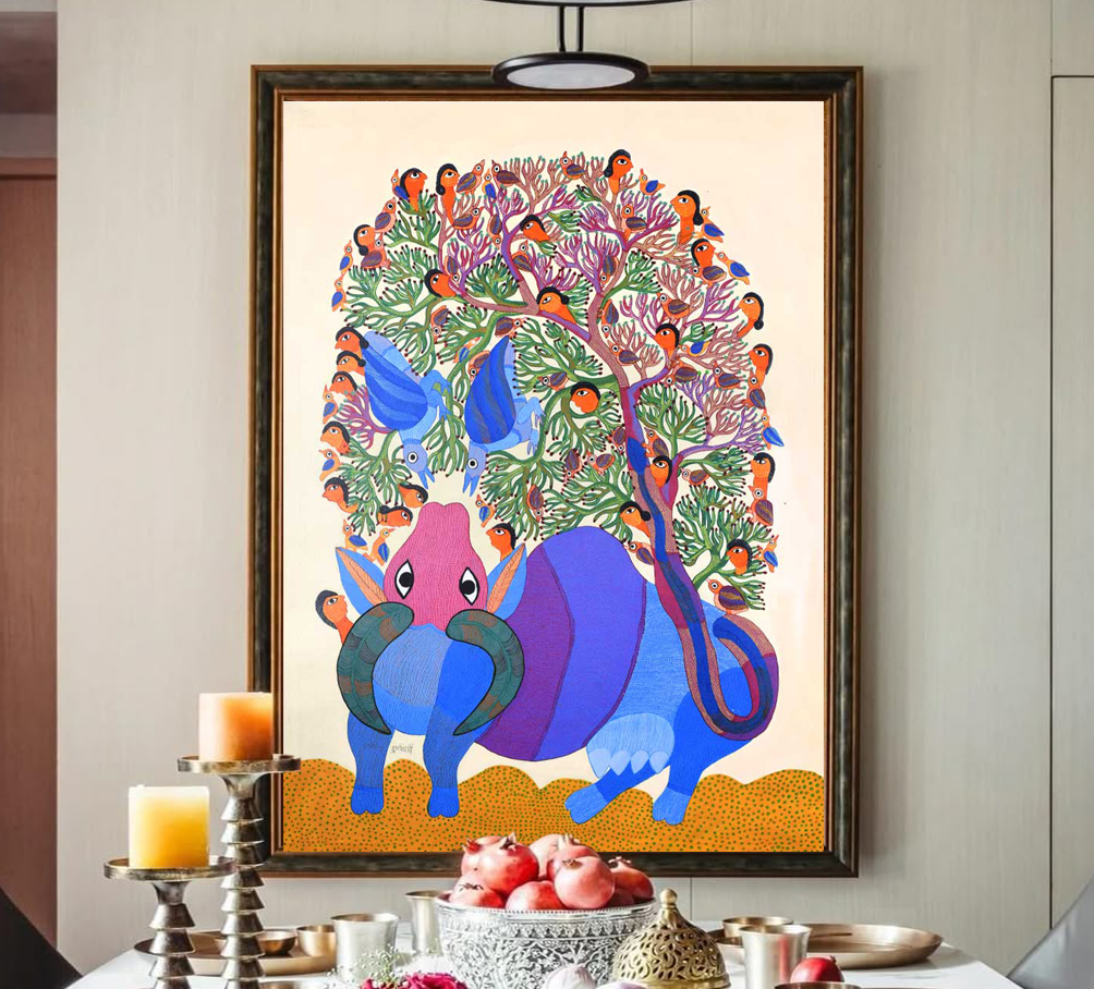 - Intricate patterns: The fine details, including dot work and geometric shapes, demonstrate Durgabai’s mastery of the traditional Gond style.