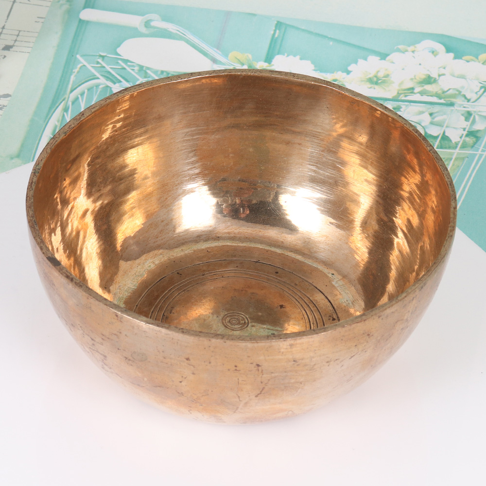This vintage bell metal singing bowl transports you to the serene Himalayan mountains of Nepal, where the ancient art of handcrafting these mesmerizing instruments has been passed down for centuries. Meticulously crafted using time-honored techniques, each bowl is a work of art that emanates a rich, soothing tone perfect for deep relaxation, mindfulness, and spiritual exploration. The plain brown finish gives this bowl a rustic, earthy aesthetic that complements any decor, while the durable bell metal construction ensures it will be a cherished centerpiece in your home for years to come. Whether you're seeking to deepen your meditation practice, create a calming ambiance, or simply reconnect with the healing power of sound, this Nepalese singing bowl is a must-have addition to your wellness toolkit.