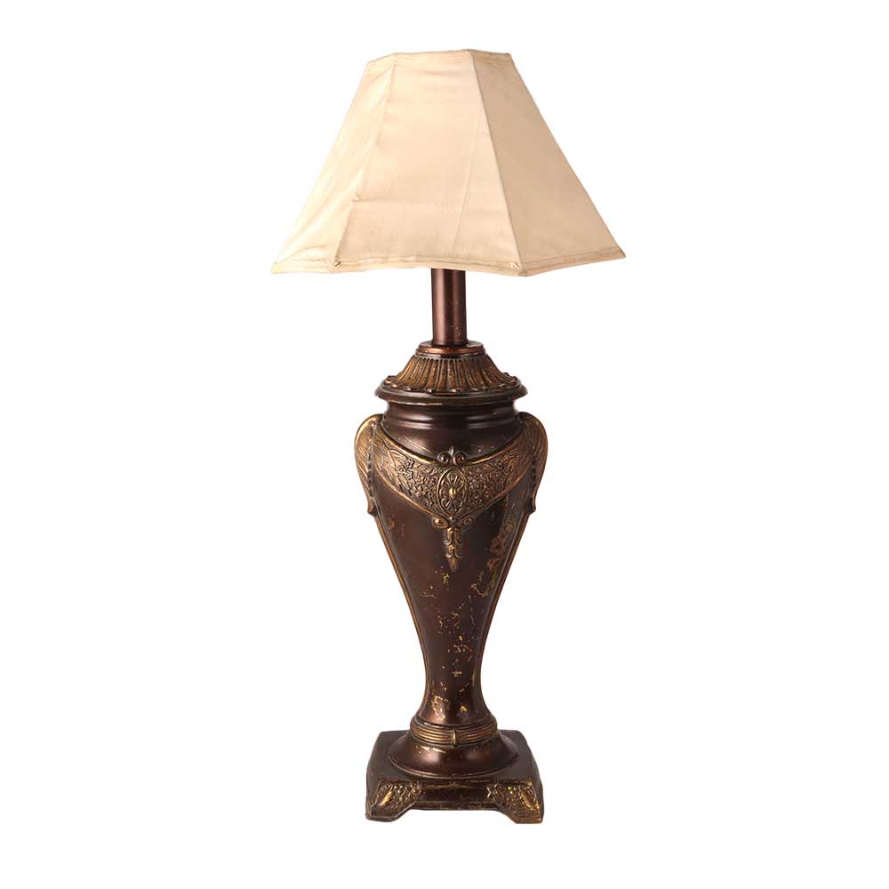 A large traditional table lamp made of a high quality bell metal alloy that will add a glamorous touch to your home decor. Insert a light bulb and plug the cord into the socket to light up your home, office or restaurant. This ornate lamp is engraved with pretty motifs to give your interior a vintage look. This bell metal lamp reminds you of your rich heritage and is eye-catching for your visitors and guests. Place this lamp with a shade in your hallway, entryway or bedroom to use at night. A traditional gift for your loved ones on special and festive occasions.