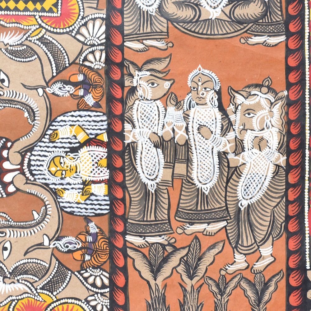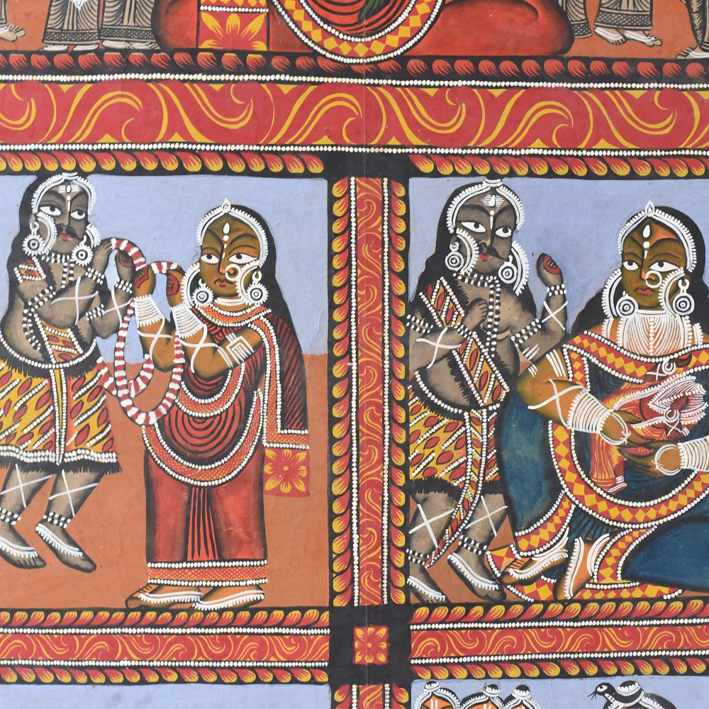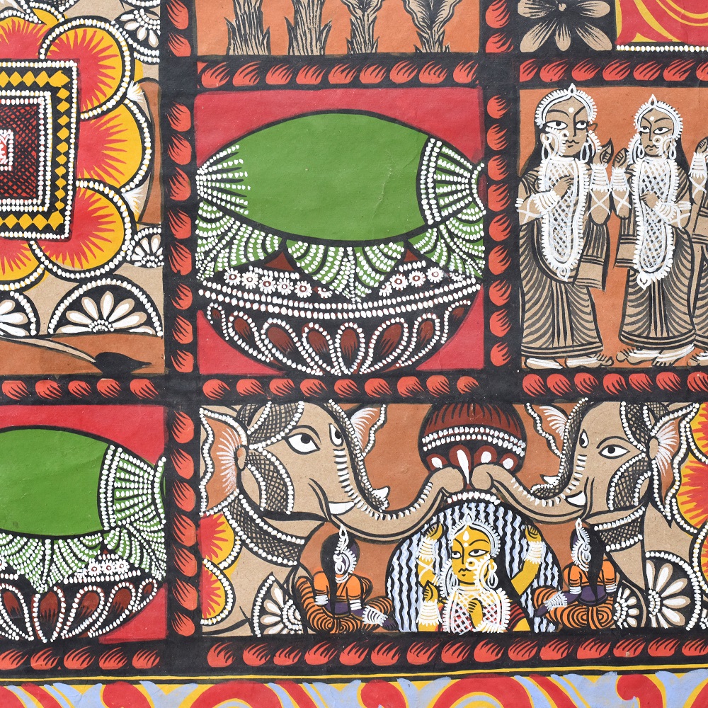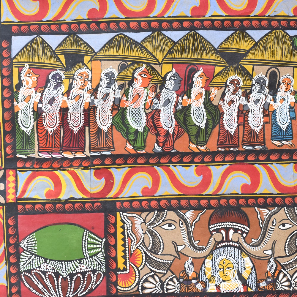 - Features traditional Bengal Pattachitra panel layout and decorative borders.