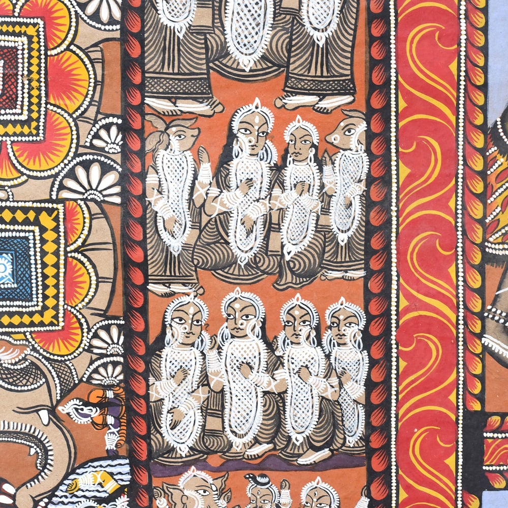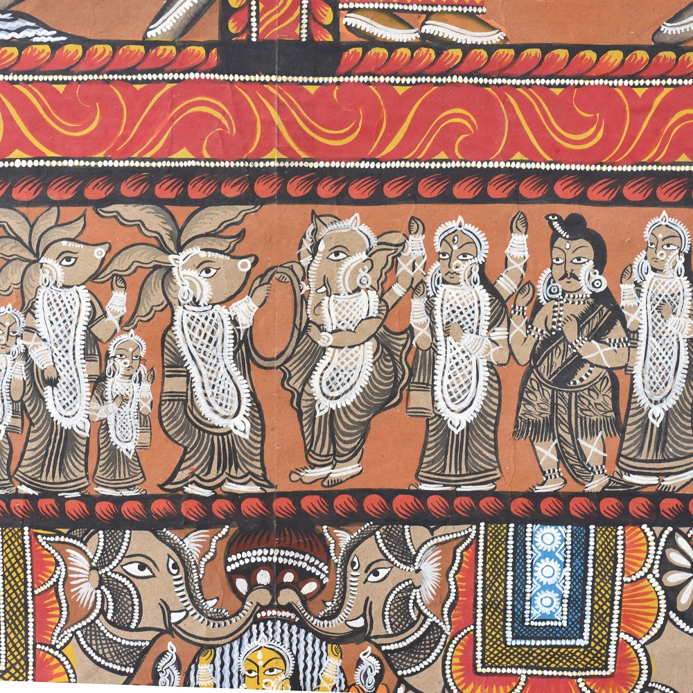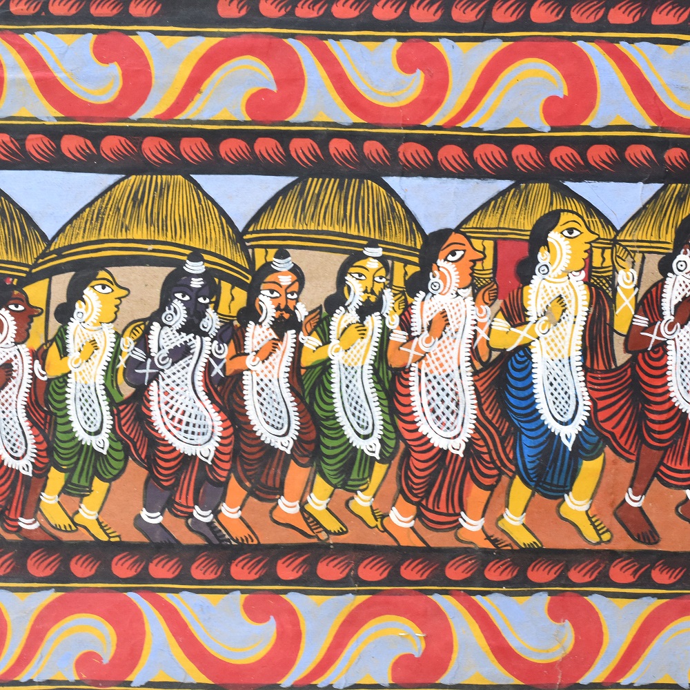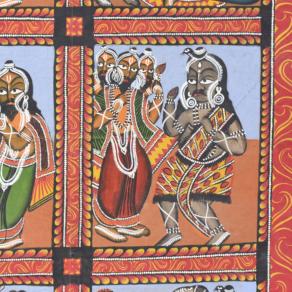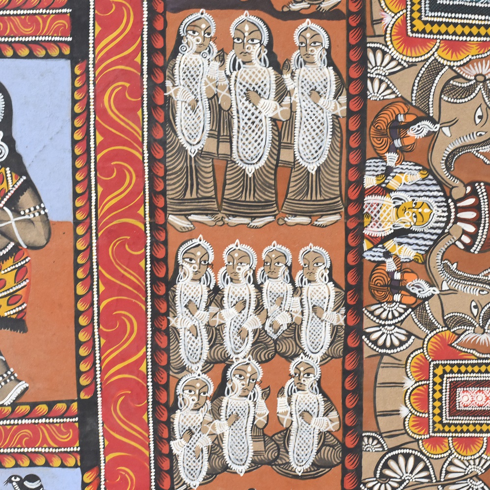 - Features traditional Bengal Pattachitra panel layout and decorative borders.
