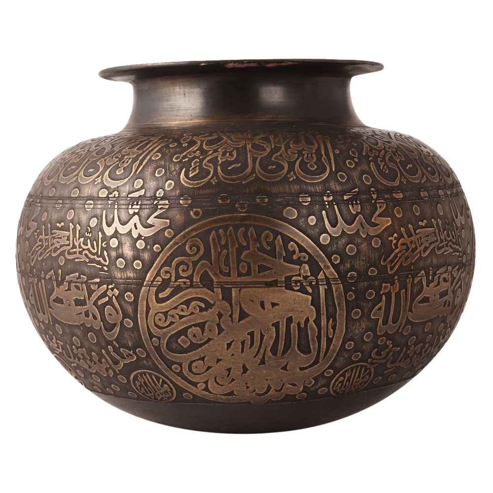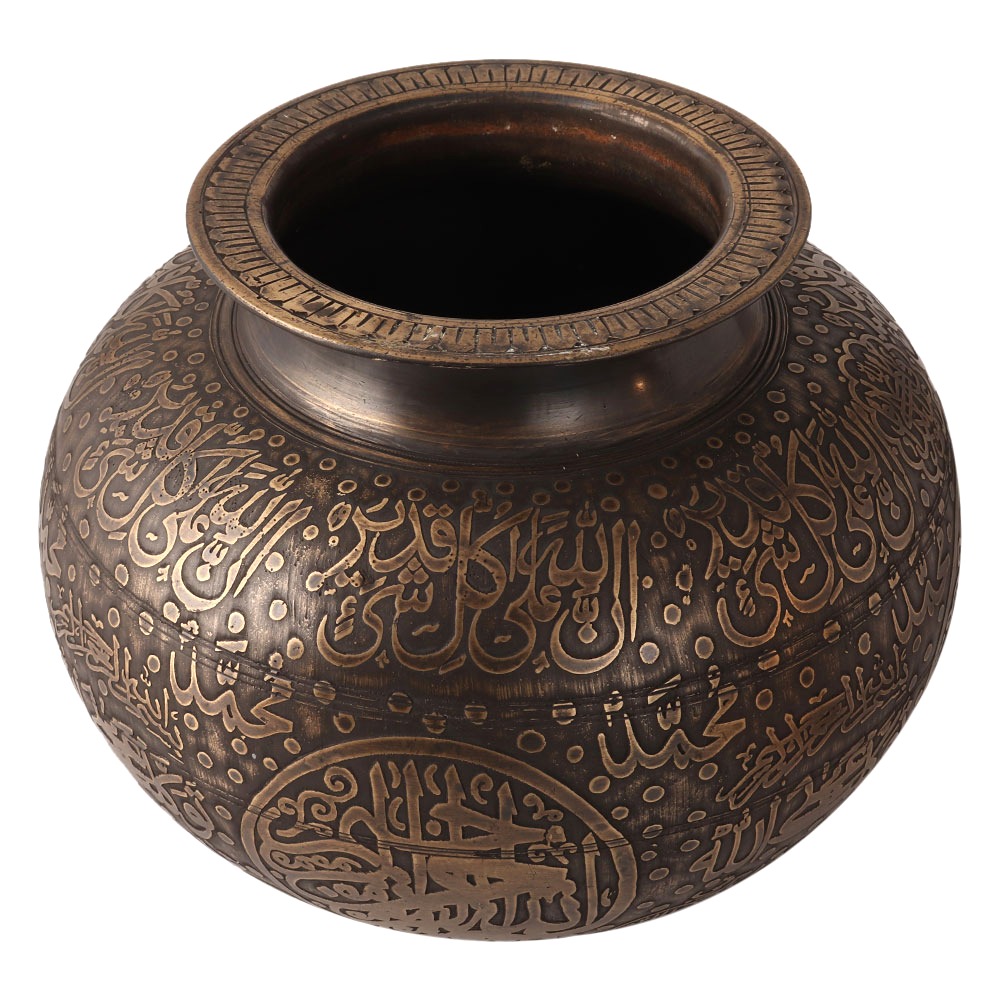 A traditionally made cooking pot using ancient techniques in Islamic art. It is made of brass. It has a dark brown surface with light brown engravings in vintage style. It was used for cooking. You can use it as a flower pot for decoration in your home, restaurant, hotel, spa or store. Place it in your home and it will be an eye-catcher for your visitors. An essential item in your vintage collection. A treat for vintage collectors to add to your collection.