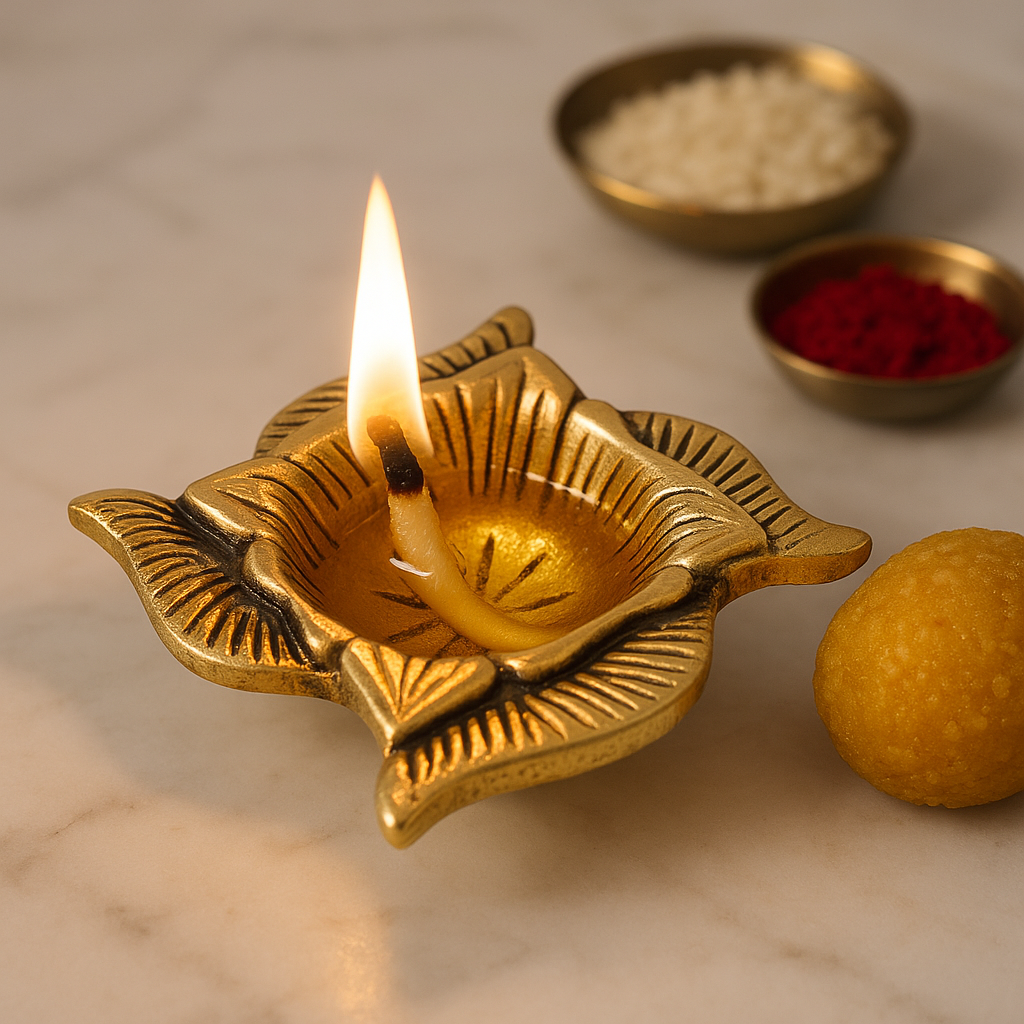 Ghee, mustard oil, or other traditional puja oils are recommended.