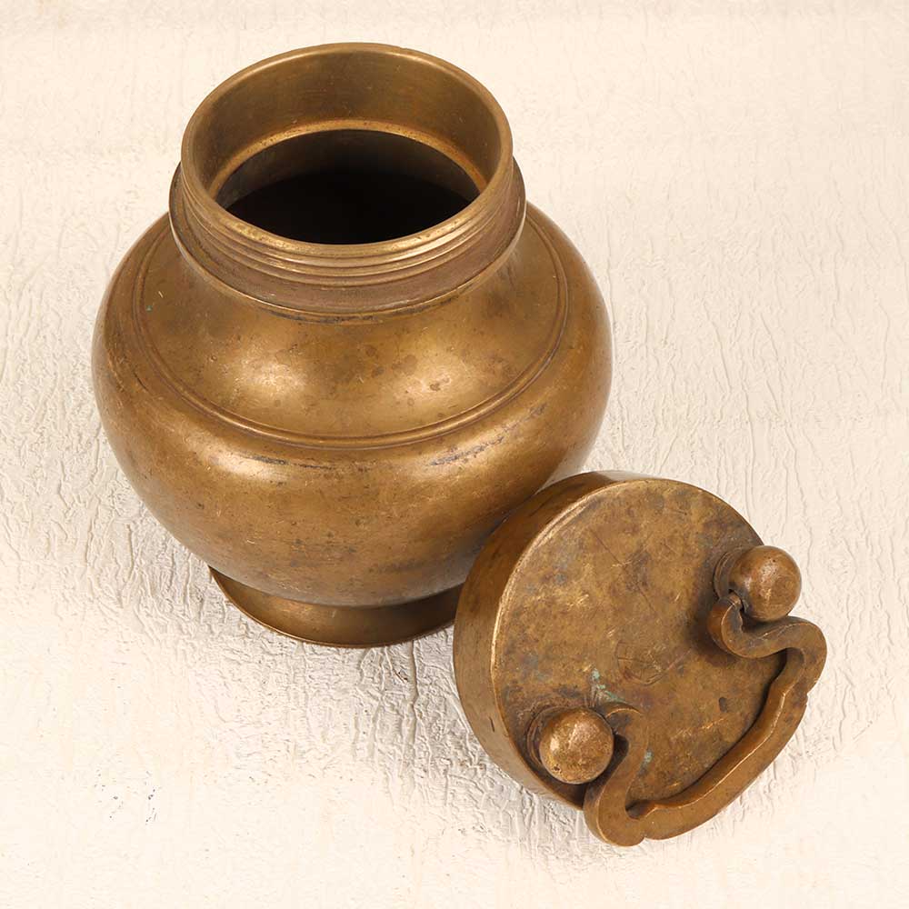 Transport yourself to an ancient Indian palace with this exquisite brass Ganga Jali water pot. Its intricate perforated floral design and vintage patina create an air of historic elegance perfect for your home decor. Bring the richness of Indian design into your home with this brass Ganga Jali pot. The delicate motif adds visual interest while the vintage patina lends an antique allure. Whether displayed on your countertop or tabletop, this pot is sure to be a conversation starter. Make your decor shine with old-world charm by adding this brass water pot to your collection. Its elegant design and artisanal craftsmanship create an authentic vintage aesthetic. Give your home a touch of history with this handmade Indian treasure. This handcrafted water vessel features:
