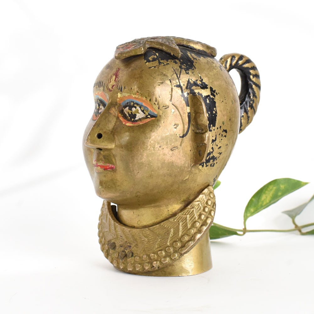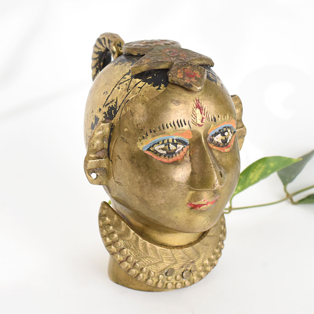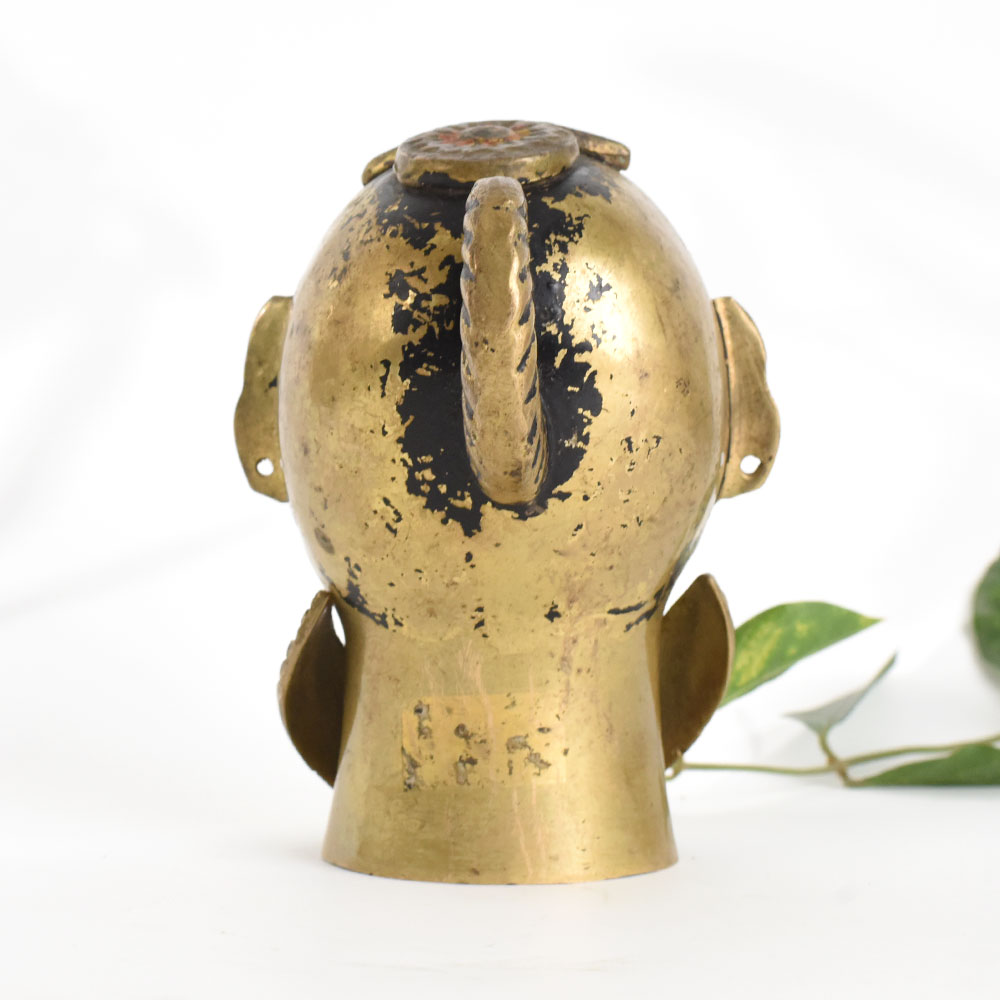 This traditional brass Gauri head sculpture adds a touch of cultural richness to your Decor. Featuring hand painted eyes, lips, and forehead detailing, the piece captures the stylised facial features of folk art. The ornate collar enhances its regal appearance, making it an eye catching decorative accent for living rooms, entryways, or studies. Handmade from brass, the sculpture exudes warmth and character, with each brushstroke revealing the artisans touch. Place it on a console or mantel to add an element of storytelling and heritage to your space. Over time, the metal develops a patina that deepens the colours and adds depth. Each sculpture is unique due to its handcrafted and hand painted nature.