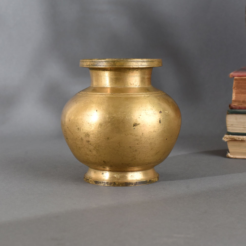 This exquisite brass holy water pot is a timeless piece of traditional craftsmanship, ideal for religious rituals and home decor. Handcrafted with precision, it features a classic round body and a wide neck, making it perfect for holding holy water during puja ceremonies. The antique brass finish adds a rustic charm and makes it a beautiful collectible for your spiritual space or a thoughtful gift for auspicious occasions. Its sturdy construction ensures durability, while the smooth polished surface reflects skilled artisanship. Whether used in daily rituals or as a decorative accent, this pot embodies cultural heritage and spiritual significance.