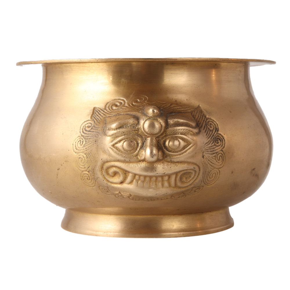 An absolute brass water pot or Lota in bright gold colour. Engraved with two embossed lion faces in Chinese art with intricate details. Because of its unique structure, it is now in high demand to add ethnic flair to households or hotels and be an eye-catcher for your guests and visitors. For centuries, it has been believed to spread positive energy in the room when placed facing north or east. This engraved water pot can be used for stage decoration at various occasions such as wedding, birthday or ceremonies.