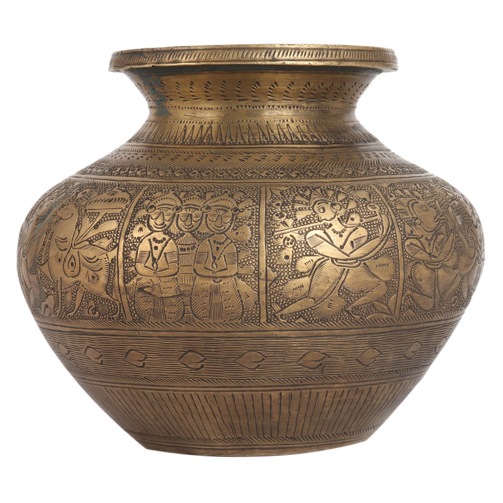This Lota or water pot is traditionally made by Indian skilled workers from Gujarat using ancient techniques with their hands. It is made of brass metal. It has a brownish colour and a flat bottom to hold on the surface. It is fully engraved with god figures and motifs. It has an antique finish with vintage look. It is used in Hindu rituals, wedding rituals and other auspicious functions. It can be used for decoration in home, office or stage. Gift on various occasions to your loved ones.