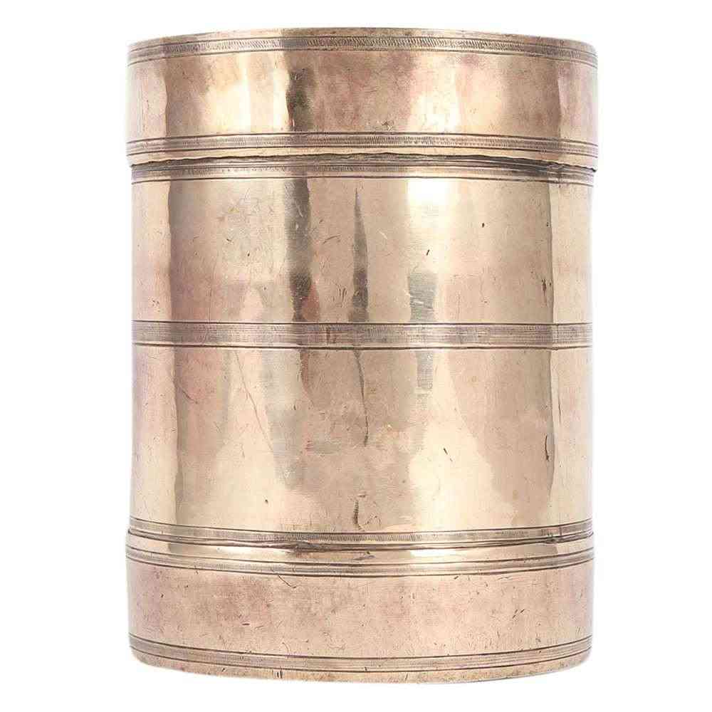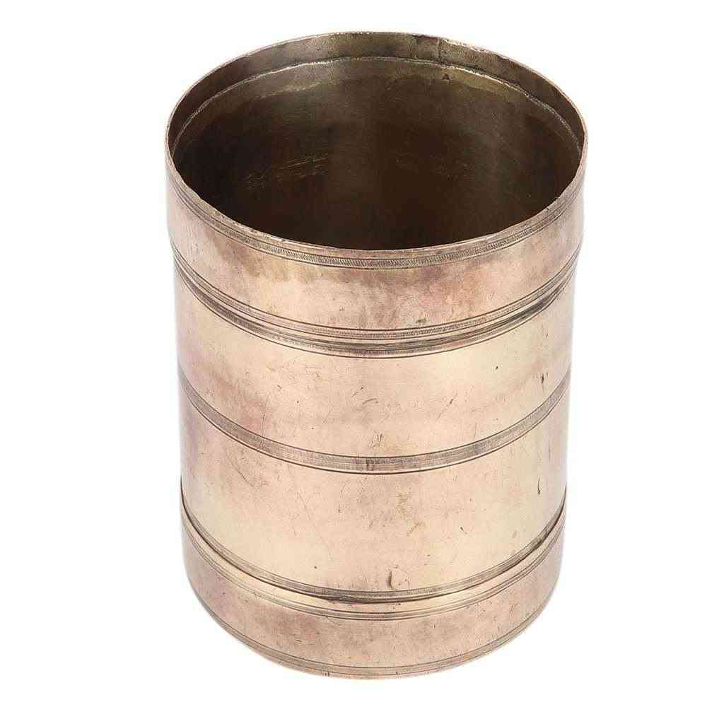Traditional measuring vessel associated with the rice paddy system in Kerala. Customarily the vessels are made of either brass, copper or a mix of both. This measuring cup has a glossy finish.