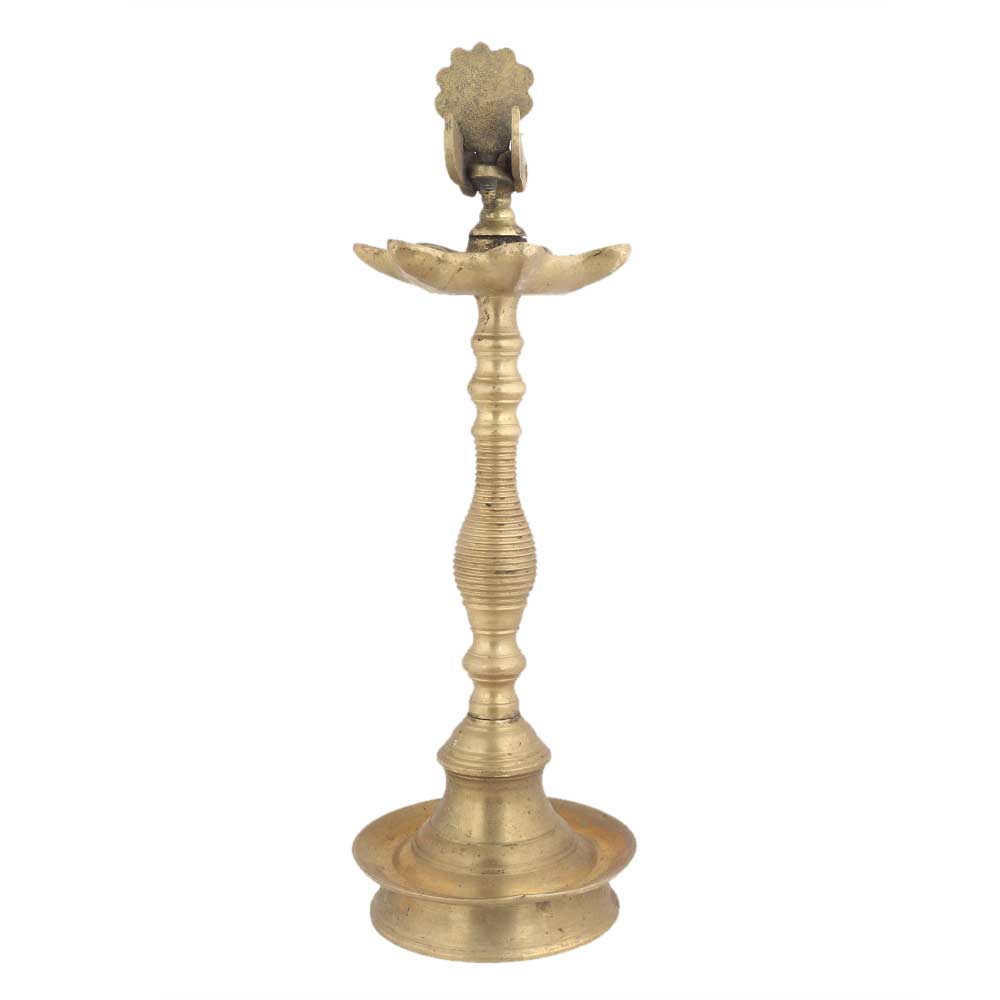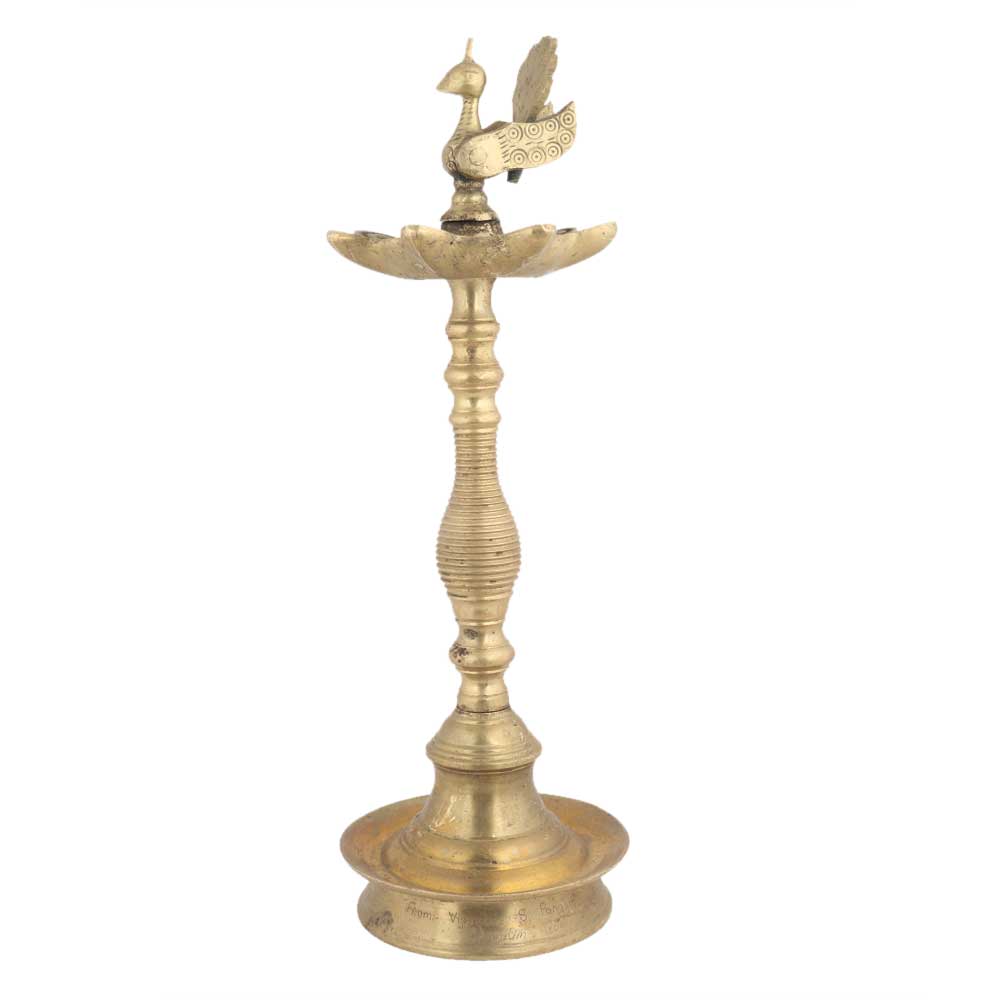 The oil lamp is symbolic and customary in almost all places of worship in India. The blessed presence of the diya makes every pooja divine and holy. This traditional brass oil lamp has a typical solid base and a long slender holder with the oil lamps and a peacock at the top. The entire piece is handmade with unmatched artistry and finesse.