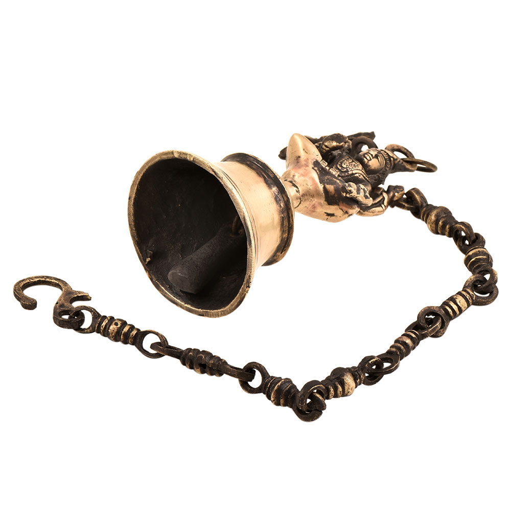 The beautiful handcrafted solid brass temple bell has a small brass Lord Shiva statue on top of the bell. A solid brass chain is attached to the bell with a big hook useful for hanging in homes or temples. The bell produces a pleasant and rich tonal sound which creates a peaceful ambience which is considered very auspicious .The bell is excellent for personal use or for gifting purpose.
