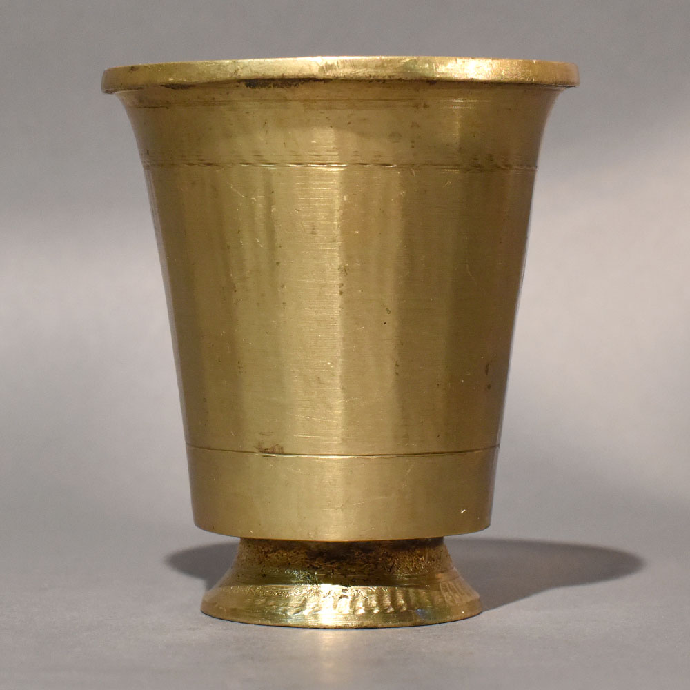 This traditional brass tumbler cup handcrafted in classic form reflects simplicity, utility, and timeless metal craftsmanship. Designed with a gently flared rim and a slightly tapered body, the tumbler offers a balanced and comfortable grip. The smooth cylindrical surface and solid base give it a clean, minimal aesthetic while maintaining traditional character. Finished in a warm golden brass tone, the cup showcases subtle circular polishing marks that highlight its handcrafted origin. The interior surface is smooth and evenly finished, making it suitable for serving water, milk, or traditional beverages. The sturdy pedestal-style base adds both stability and a refined visual touch. Brass utensils have long been valued in Indian households for their cultural significance and durability. This handcrafted brass tumbler can be used for daily rituals, pooja ceremonies, festive gatherings, or as part of traditional dining setups. It also serves as a decorative accent in heritage-themed kitchens or display shelves. Crafted using time-honored metal shaping techniques, the tumbler is durable and designed for long-term use. Minor tonal variations enhance its authenticity and reflect artisanal workmanship. Its versatile design allows it to blend seamlessly into both traditional and contemporary settings.