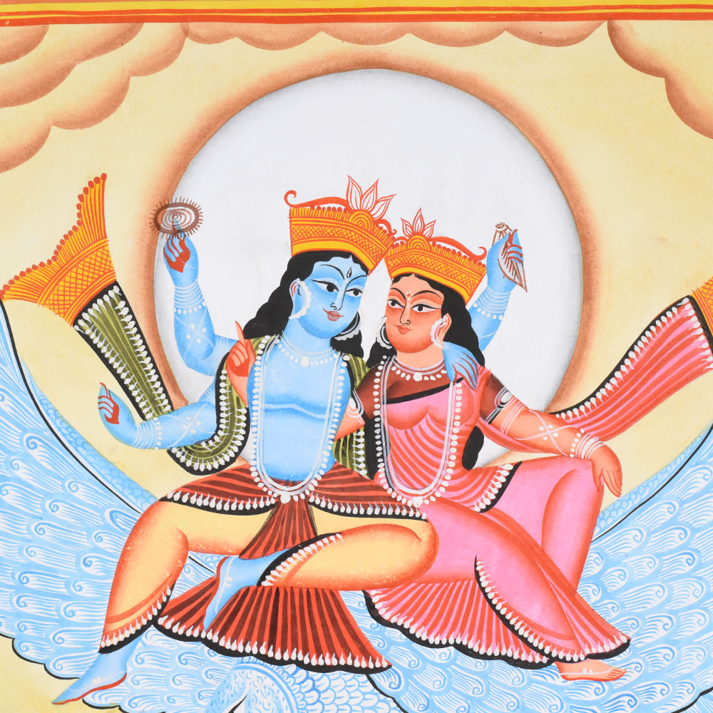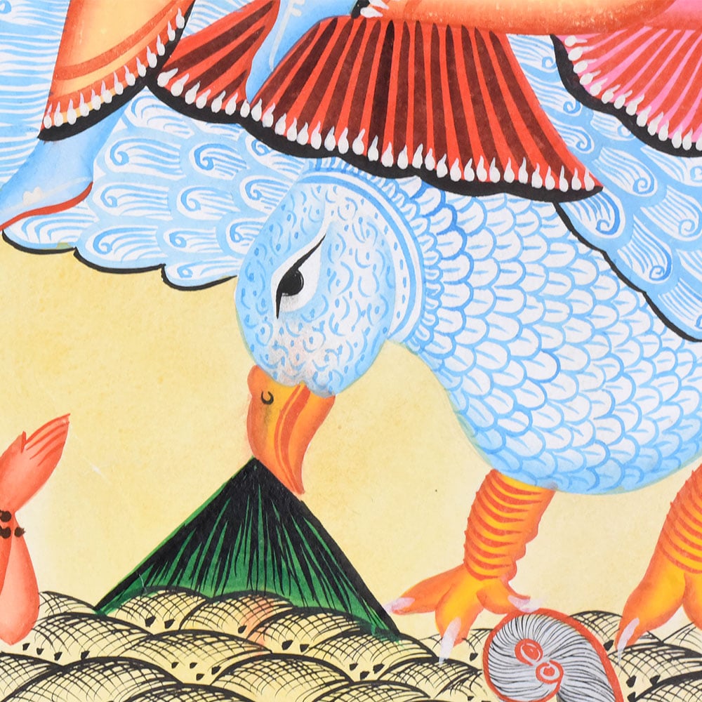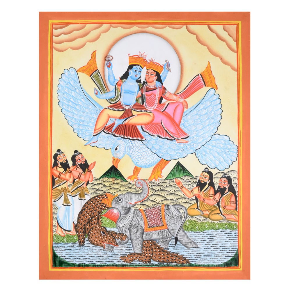 Vishnu and Lakshmi seated together on Garuda with expansive wings Central halo highlighting the divine couple Gajendra the elephant battling the crocodile in stylized water below Sages and devotees arranged symmetrically in reverence, with bold outlines and flat colors typical of Kalighat styleProduct Specification