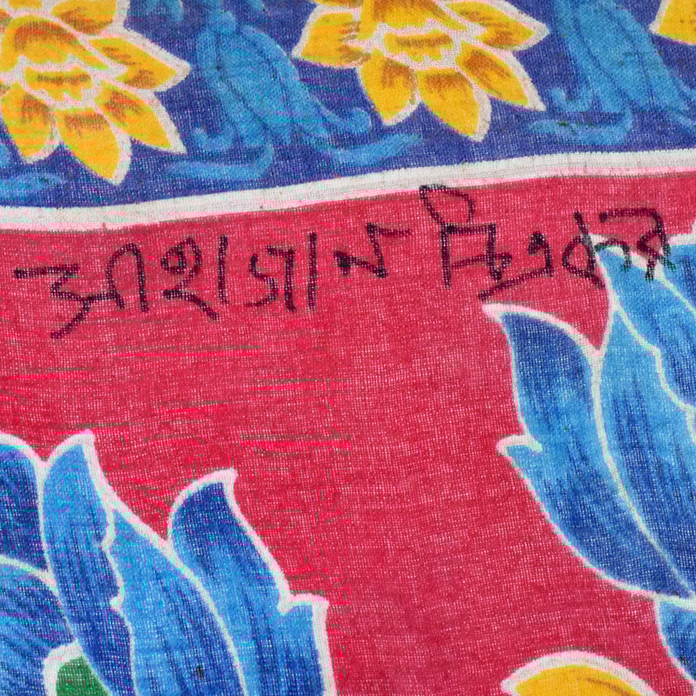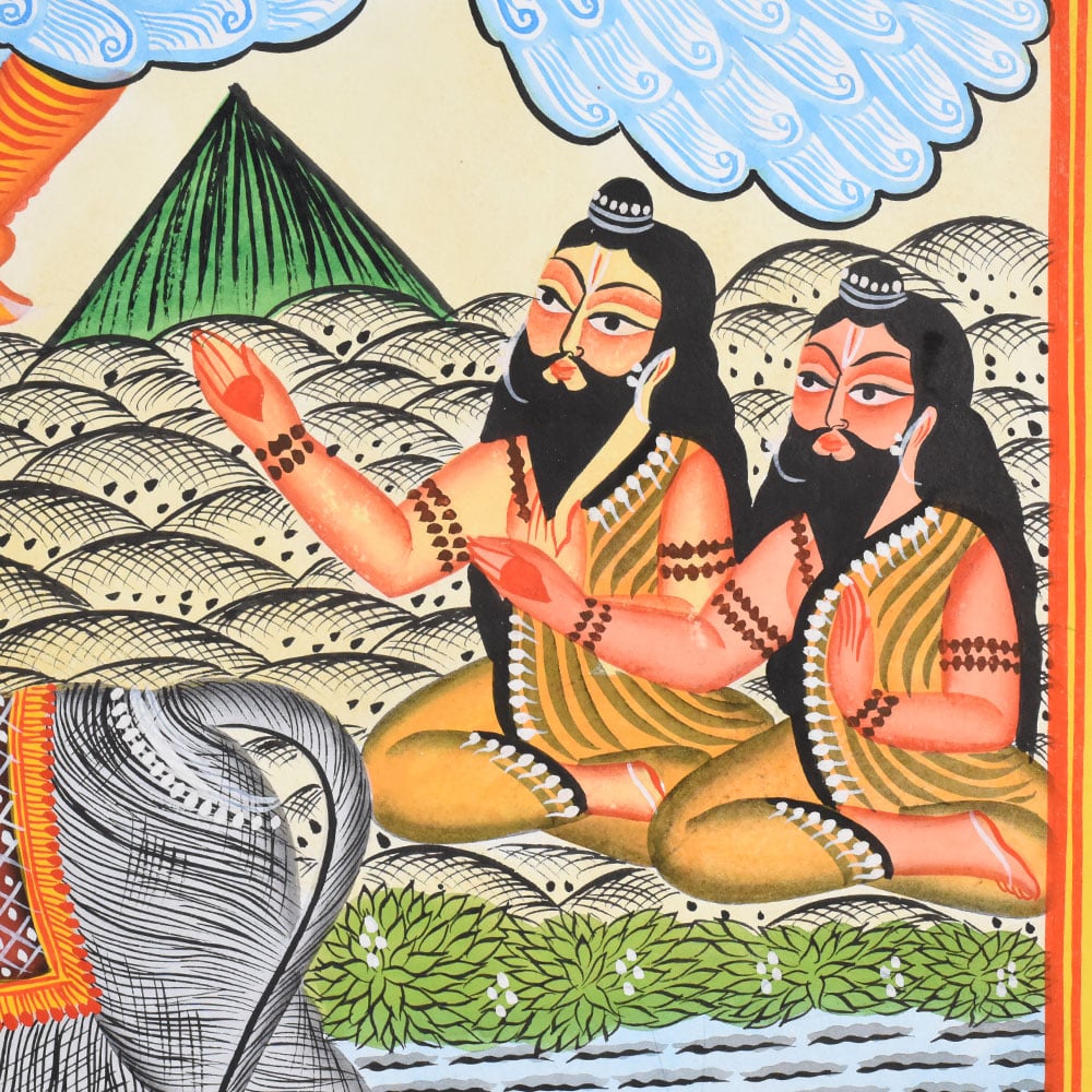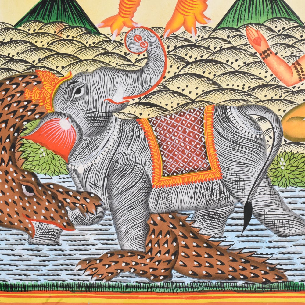 This Kalighat painting on cloth and paper depicts a dramatic and auspicious mythological scene featuring Lord Vishnu and Goddess Lakshmi seated together on Garuda, the divine eagle. Positioned centrally, the divine couple is shown in close harmony, their bodies gently inclined toward one another, symbolizing cosmic balance, protection, and prosperity. Vishnus blue-toned skin and calm expression contrast beautifully with Lakshmis warm hues and graceful posture. A radiant circular halo behind them emphasizes their divine status and draws immediate focus to the celestial union. Garuda dominates the middle ground with outstretched wings rendered in soft blues and white patterns, giving a strong sense of motion and descent. Below, the narrative unfolds on the earthly plane where Gajendra the elephant is shown caught in a fierce struggle with a crocodile in the river. The elephants raised trunk and strained posture convey urgency and distress, referencing the well-known Gajendra Moksha episode, where Vishnu descends to rescue his devotee. The rippling water is depicted through repeated horizontal lines, a classic Kalighat technique that suggests movement while maintaining flatness. On either side of the lower scene, sages and devotees are shown with folded hands and attentive gazes, witnessing the divine intervention. Their stylized faces, elongated eyes, and simplified forms reinforce the folk-art character of the painting. The background features layered earth patterns and soft clouds above, enclosed within a bold decorative border. Executed on cloth and paper, this work exemplifies the Kalighat traditions ability to merge storytelling, devotion, and striking visual clarity into a single, powerful composition.