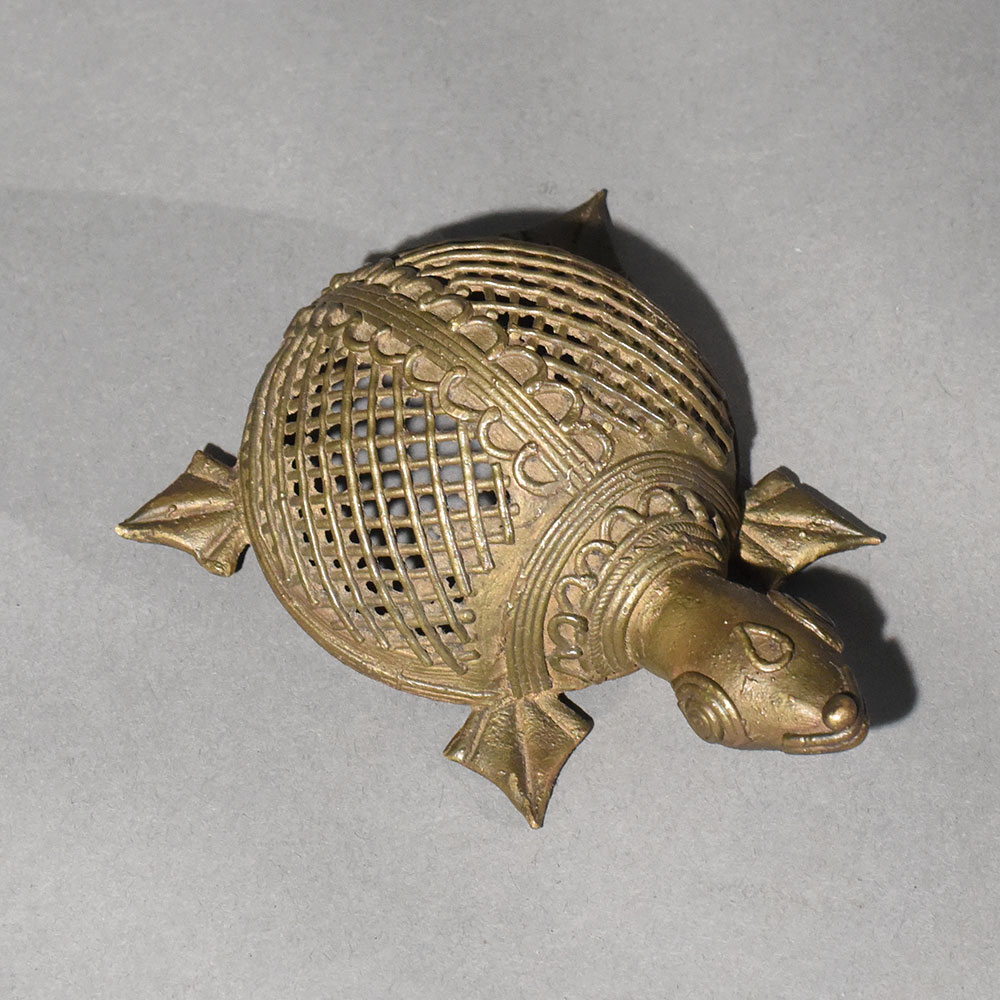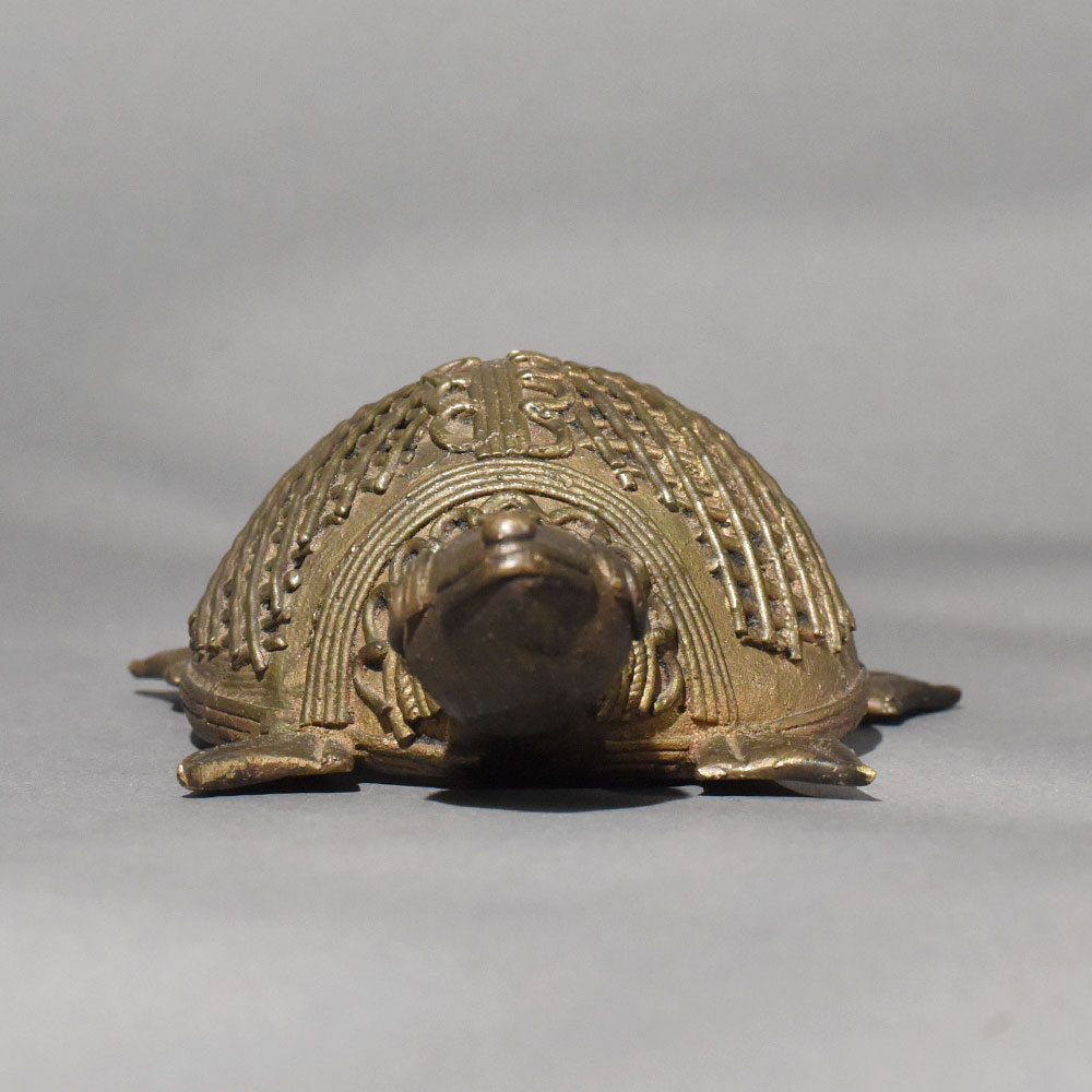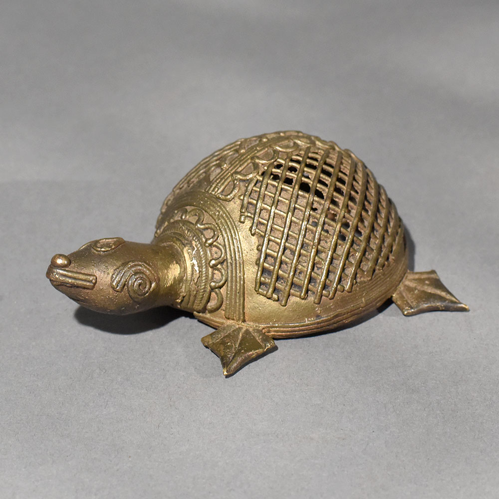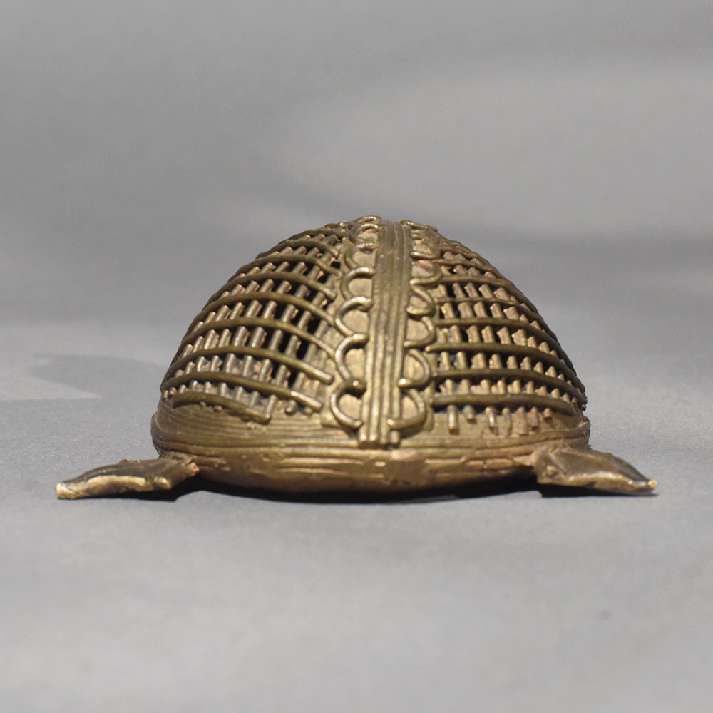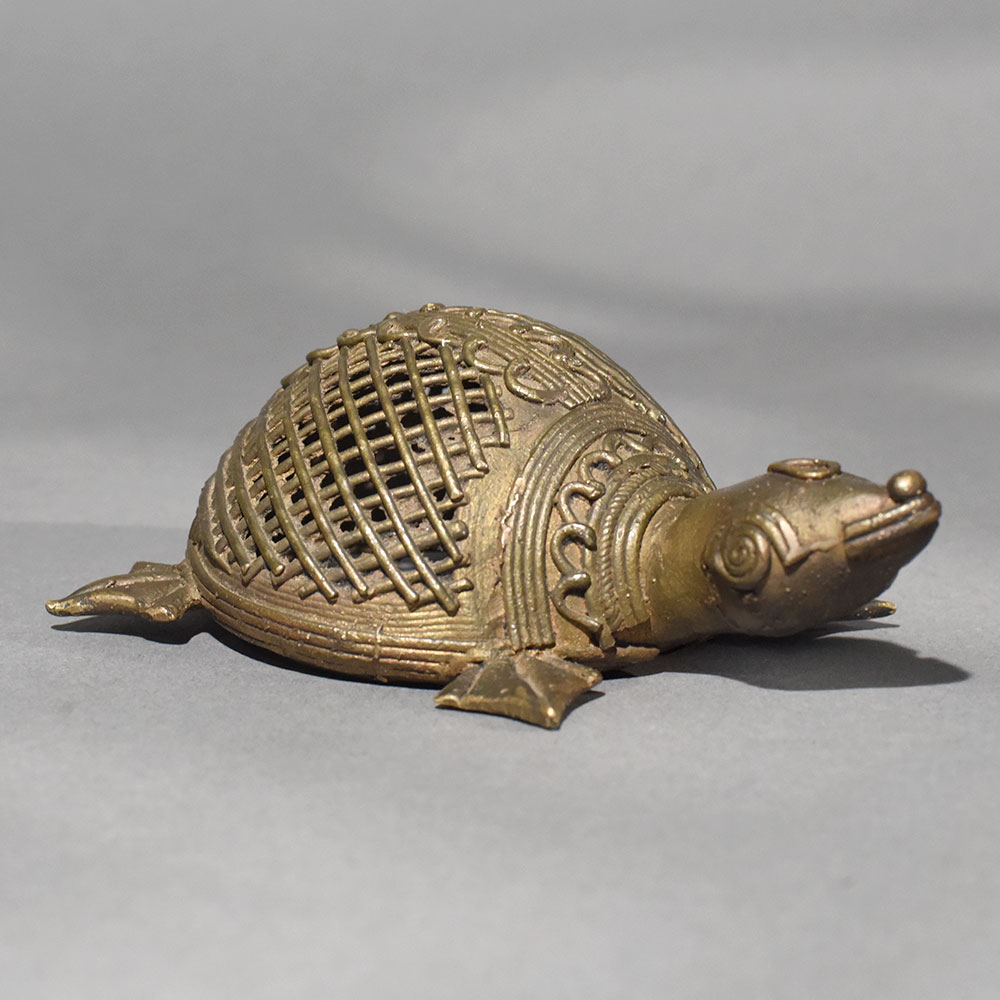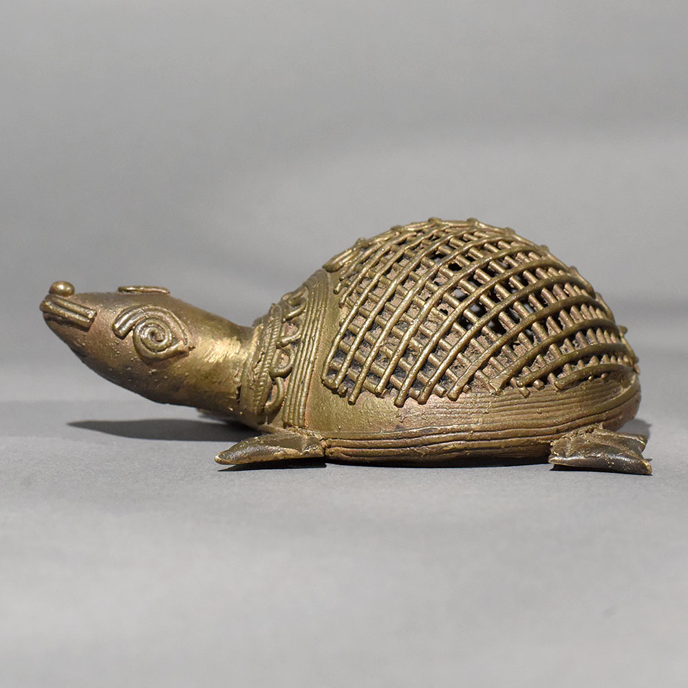 This handmade Dhokra art brass tortoise figurine is a beautiful expression of Indias ancient lost-wax metal casting tradition. Crafted by skilled tribal artisans, the tortoise features intricate hand-etched patterns and a distinctive lattice shell design, reflecting the authenticity of true Dhokra craftsmanship. Made from solid brass, the figurine carries a warm vintage patina that adds depth, character, and timeless appeal. In many cultures, the tortoise symbolizes stability, longevity, and prosperity, making this piece both decorative and meaningful. Its compact size allows it to be placed effortlessly on tabletops, office desks, shelves, pooja spaces, or vastu-inspired dcor settings. The detailed facial features, sturdy legs, and textured shell highlight the patience and skill involved in traditional handmade artistry. Ideal for collectors of ethnic dcor, lovers of folk art, or as a thoughtful housewarming or festive gift, this brass tortoise brings heritage charm into modern interiors. Whether styled in a contemporary or traditional space, it stands out as a soulful accent that celebrates sustainable craftsmanship and cultural legacy.