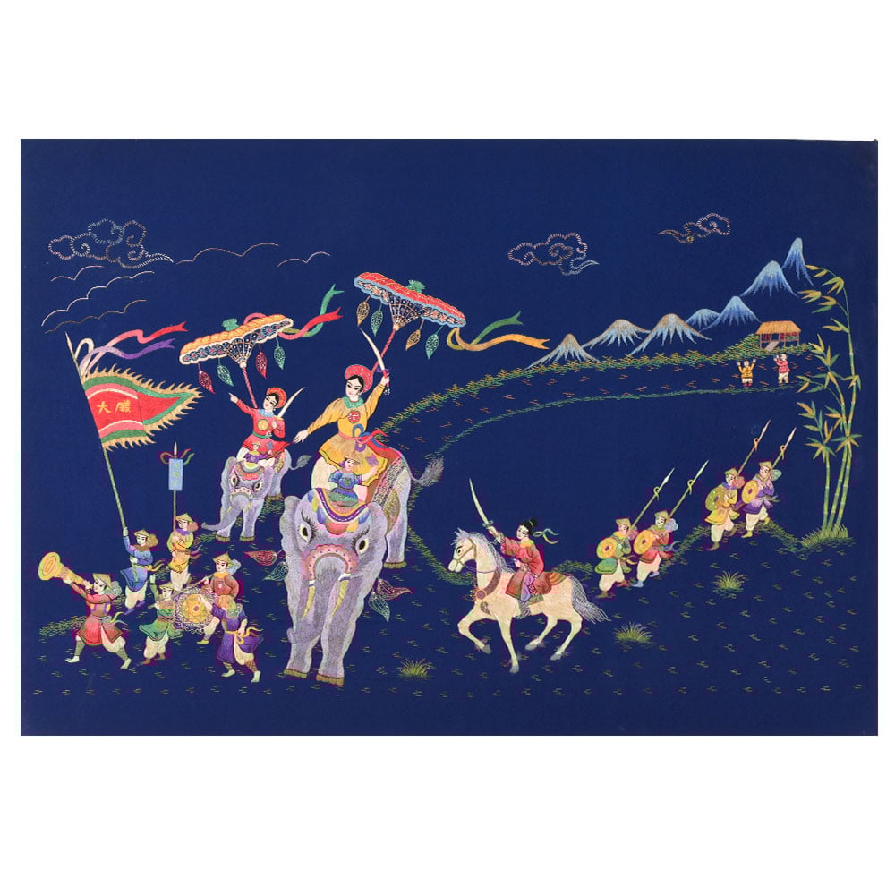 This vibrant and intricate artwork is a fine example of traditional thread work on cloth, carefully mounted on hardboard for preservation and display. The scene depicts a grand ceremonial procession, richly embroidered with colorful threads on a deep blue fabric background. At the forefront, two magnificently adorned elephants carry figures dressed in regal attire, holding swords and shaded by ornate parasols decorated with multicolored tassels and leaf motifs. A decorated horse, ridden by another noble figure, leads the way, followed by soldiers carrying spears and shields in coordinated formation. The detailing is extraordinary - from the expressive faces of the participants to the elaborate patterns on the elephants’ and horses’ trappings. Musicians, flag bearers, and attendants contribute to the festive and triumphant atmosphere, while the background features stylized mountains, clouds, bamboo, and a small rural hut, all rendered in fine embroidery. The contrast of vivid reds, yellows, greens, and purples against the deep blue cloth gives the piece a striking visual appeal. This handcrafted textile artwork not only captures the essence of cultural pageantry but also showcases the remarkable skill and patience of traditional artisans. Ideal for collectors of textile art, cultural décor, or heritage displays.