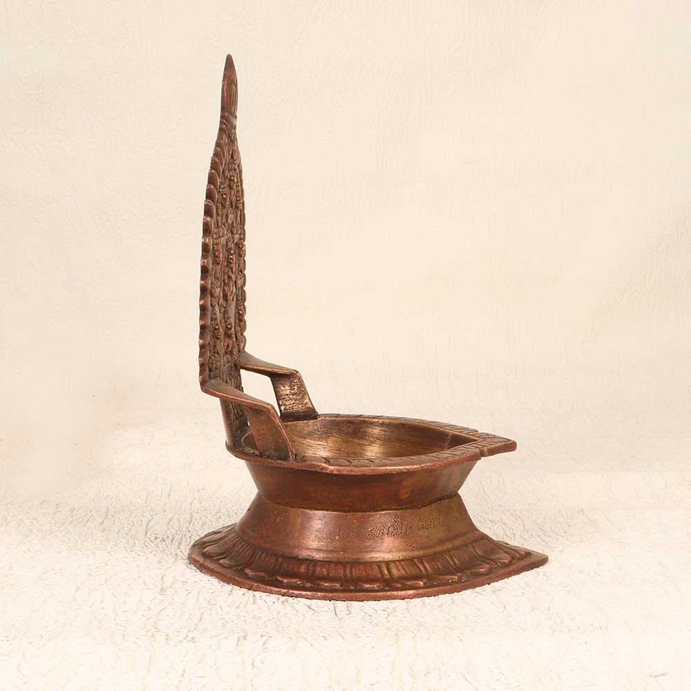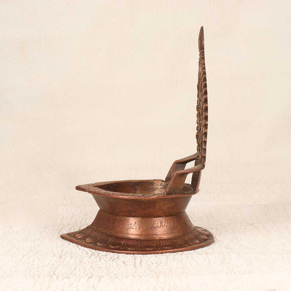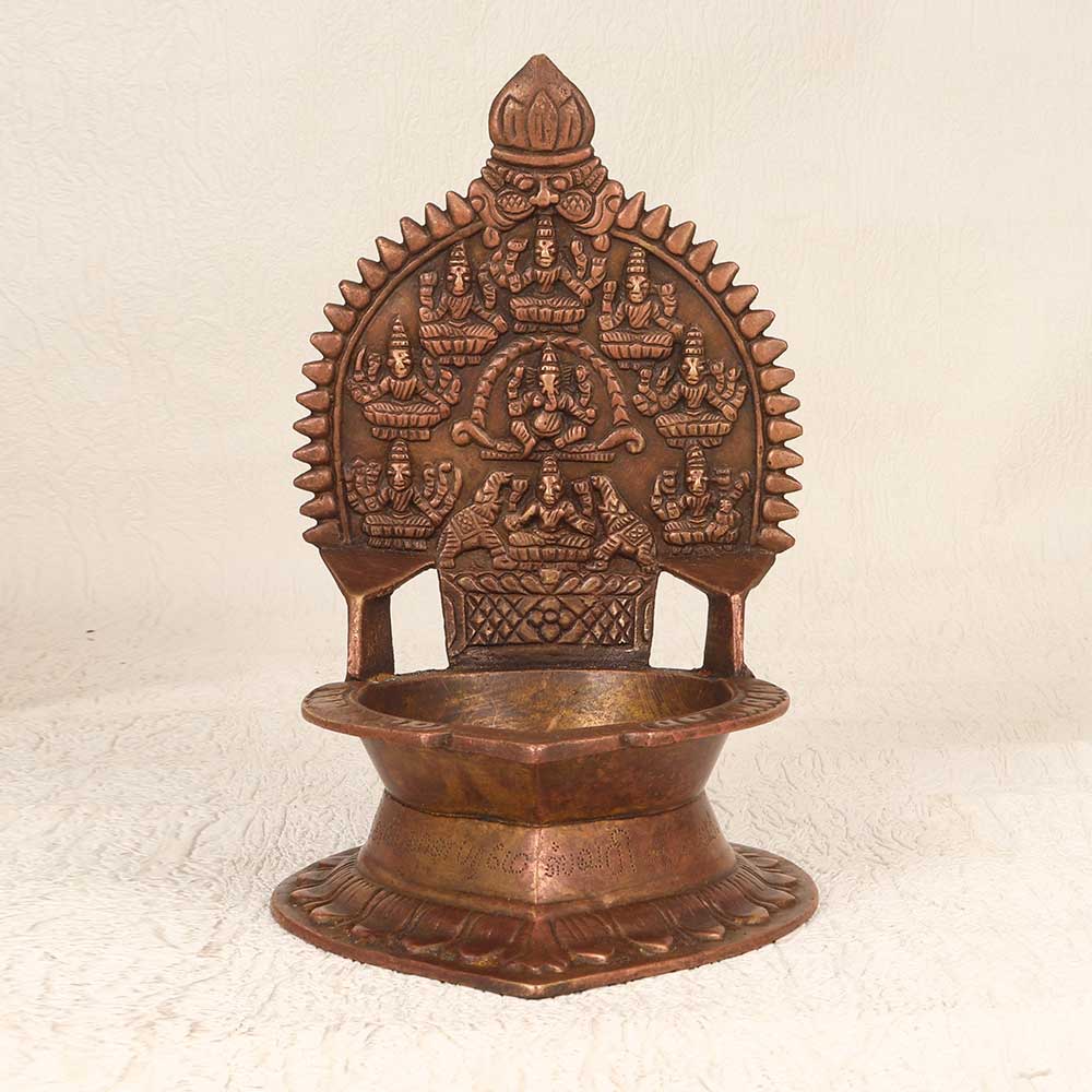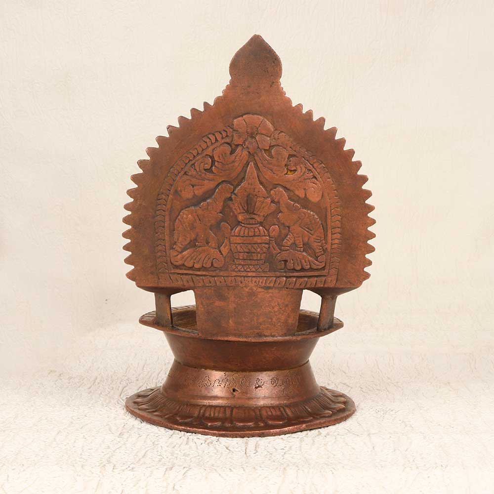 Bring divine light into your home with this exquisite vintage brass Gajlaxmi Oil Lamp. Crafted in the traditional style of South Indian art, this lamp features the auspicious Gajlaxmi motif surrounded by ornate floral and vine designs. With its antiqued patina and elegant curves, this lamp makes a graceful statement wherever it's placed. This special lamp invokes the blessings of the goddess while creating a serene ambiance. The soft, flickering light sets a relaxing mood, making it ideal for puja rooms, bedrooms, living rooms, and more. Place it on a side table, bookshelf, or mantle to enjoy its beauty and symbolic meaning every day. Give your home a touch of divine grace with this antique Gajlaxmi lamp.