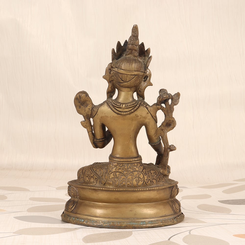 Bring the divine feminine into your home with this exquisite vintage brass Goddess Tara Statue. Goddess Tara is a beloved figure in Tibetan Buddhism, revered as the "mother of liberation" and a symbol of compassion. This stunning brass statue invites you to connect with her nurturing, protective energy every day. The level of detail is awe-inspiring, from the delicate facial features to the ornate jewelry and flowing robes. This vintage Tara statue is a work of art that will infuse your space with sacred feminine power. Place her on your meditation altar, bookshelf, or any prominent spot to cultivate a sense of tranquility and spiritual awakening. As you gaze upon her serene expression, let her calming presence wash over you and inspire you to embody the qualities of wisdom, kindness, and unconditional love. Whether you're a devoted Buddhist practitioner or simply appreciate fine art and home decor, this Goddess Tara statue is a stunning addition that will elevate the energy of any room. Invite the divine feminine into your life and let her guide you on your spiritual journey.