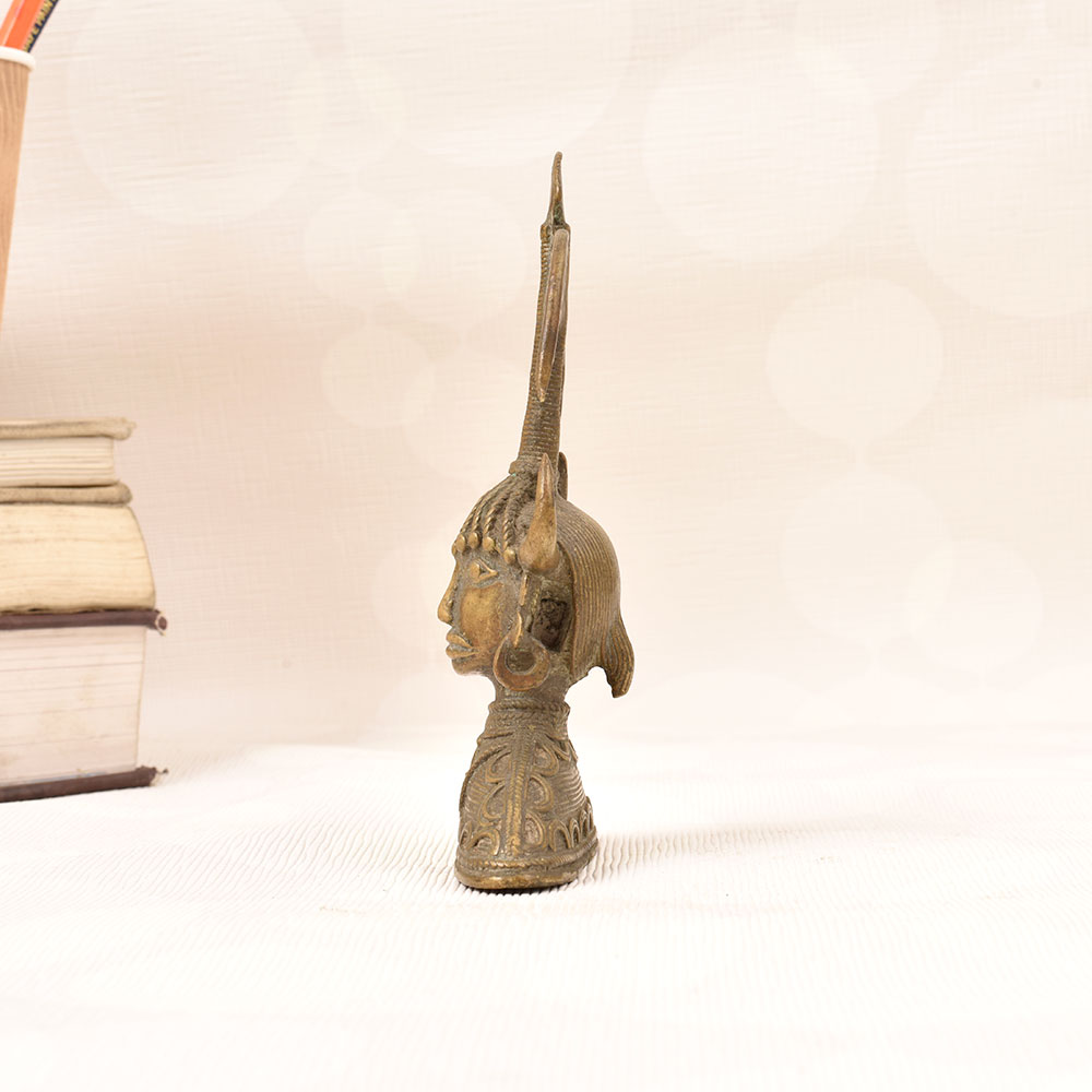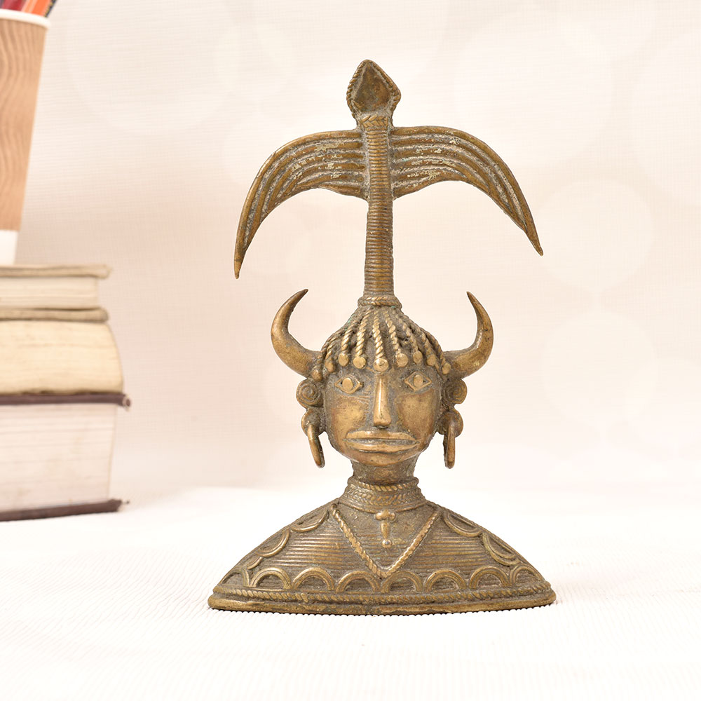 Behold the captivating essence of ancient folklore, now immortalized in gleaming brass. The Folk Brass Female Bust Statue with Horns is a stunning work of tribal art that commands attention and ignites the imagination. This breathtaking statue is more than just a decorative piece - it's a portal into a realm of timeless wisdom and primal power. The female figure, adorned with striking horns, embodies the sacred feminine energies revered by traditional societies. Her stoic gaze and commanding presence evoke a sense of profound spiritual connection, inviting you to explore the rich tapestry of human history and the enduring allure of tribal art. Whether displayed on a mantel, side table, or bookshelf, the Folk Brass Female Bust Statue with Horns will captivate and inspire all who behold it. Infuse your living space with the captivating essence of ancient cultures and let this magnificent piece transport you to a world of mysticism and wonder. Embrace the timeless beauty of this stunning tribal art sculpture and let it become a cherished centerpiece in your home.