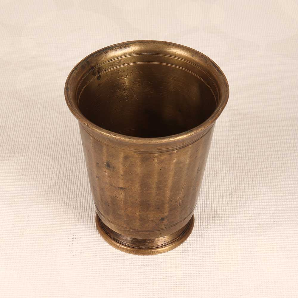Step back in time with this gorgeous vintage brass holy water cup, a stunning accent piece from South Indian Art in a plain brown finish. This cup offers an elegant way to display flowers and add a touch of antique charm to any space. The intricate detailing and handcrafted artistry reflect impeccable Indian craftsmanship, making this cup a true treasure. The cup features a classic pedestal design with an ornate lotus flower motif. The antique brass finish lends a refined, vintage aesthetic. Perfect for holding a small floral bouquet or just displaying on its own, this cup makes a striking decorative accent. Place it on an entryway table, mantel, or shelf to elevate your decor. For lovers of antiques and vintage decor, this brass cup is a must-have. Displaying flowers or trinkets in this cup allows you to highlight its artisanal details and quality craftsmanship. A gorgeous conversation piece, it will lend sophistication to any room. Add old world charm to your home decor with this beautiful handmade brass cup.