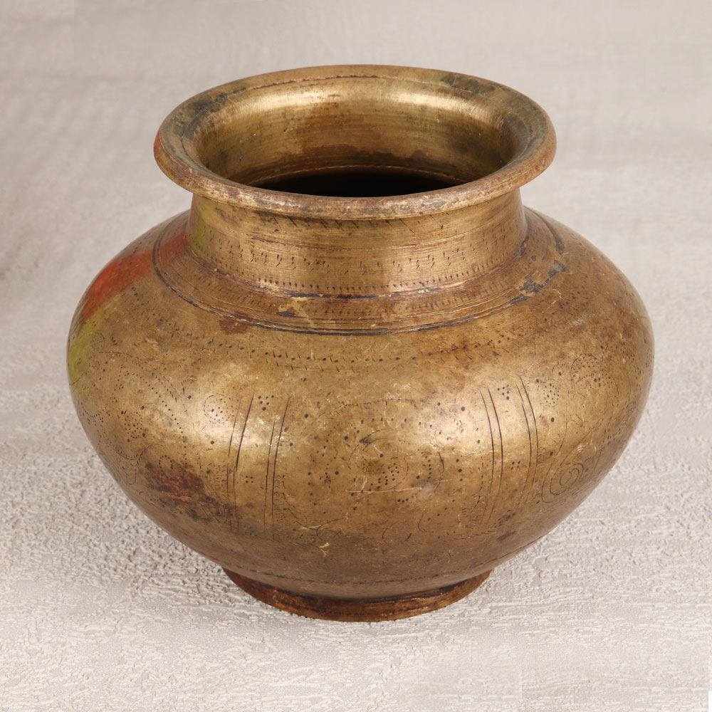 Immerse your sacred rituals in timeless elegance with this Vintage Brass Holy Water Pot that is a masterpiece handcrafted by talented Indian artisans from Gujarat. Made with precision and devotion, the pot boasts intricate carvings that weave a story of tradition and spirituality. The high-quality Brass construction, coupled with an antique brown finish, exudes an old-world charm that adds a touch of heritage to your prayer space. This versatile pot serves a dual purpose – perfect for holding holy water during prayers, havans, and auspicious occasions, while also doubling as an exquisite base for flower decorations. Its allure extends beyond religious ceremonies, as it transforms any space into a haven of aesthetic splendour. Whether adorning your home, office, restaurant, hotel, or cafe, this Brass pot becomes a captivating centerpiece, inviting admiration and conversation. An ideal addition to any vintage collection, this pot makes for a thoughtful and cherished gift for your loved ones on special, festive, or auspicious occasions.