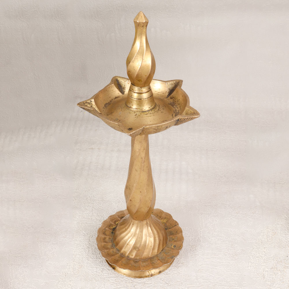 Immerse yourself in the timeless charm of this exquisite vintage brass oil lamp that is a testament to the rich heritage of South Indian artistry. Crafted by skilled Indian artisans, this masterpiece showcases the art of brass craftsmanship, featuring an antique brown finish that adds an air of authenticity and elegance. With the capacity to illuminate five jyots simultaneously, this lamp offers a spiritual ambience during prayers at the temple or within the sacred confines of your home, office, restaurant, hotel, or cafe prayer room. Designed for versatility, this lamp uses mustard oil or ghee with cotton wicks, recreating the traditional essence of bygone eras. Its exceptional quality ensures durability and longevity, making it a cherished addition to any vintage collection. Beyond personal enjoyment, this lamp makes for a thoughtful and meaningful gift for your loved ones on special, festive, or auspicious occasions, carrying with it the artistry and spirituality of South Indian craftsmanship.