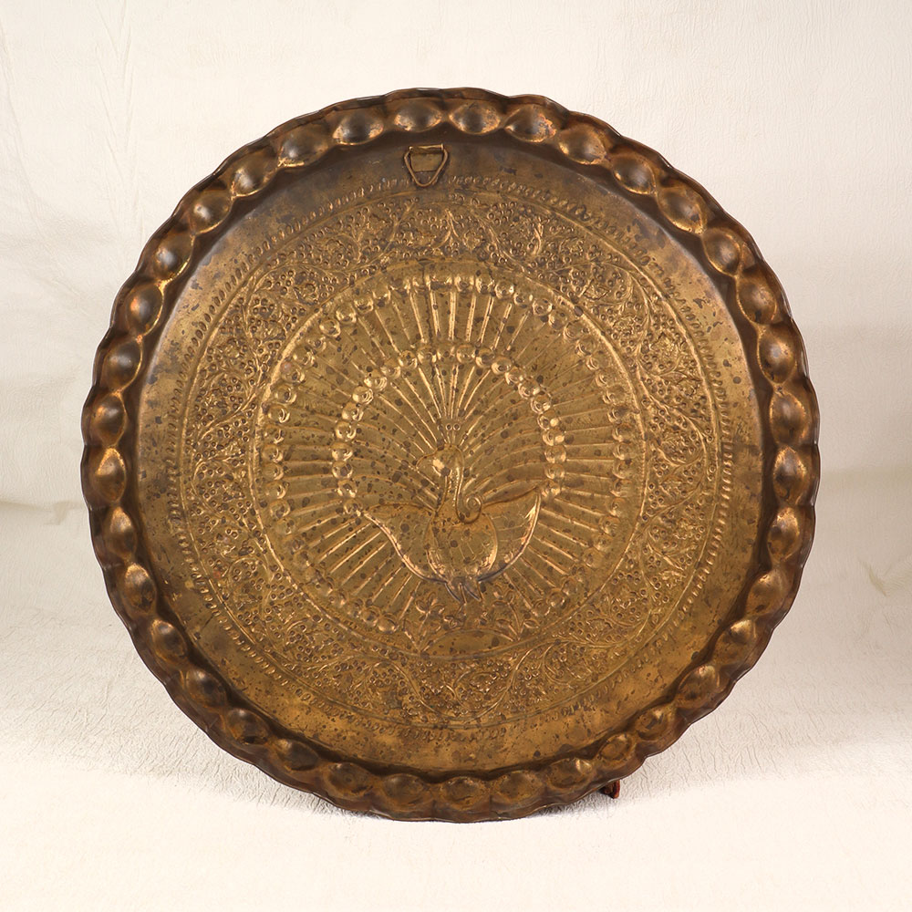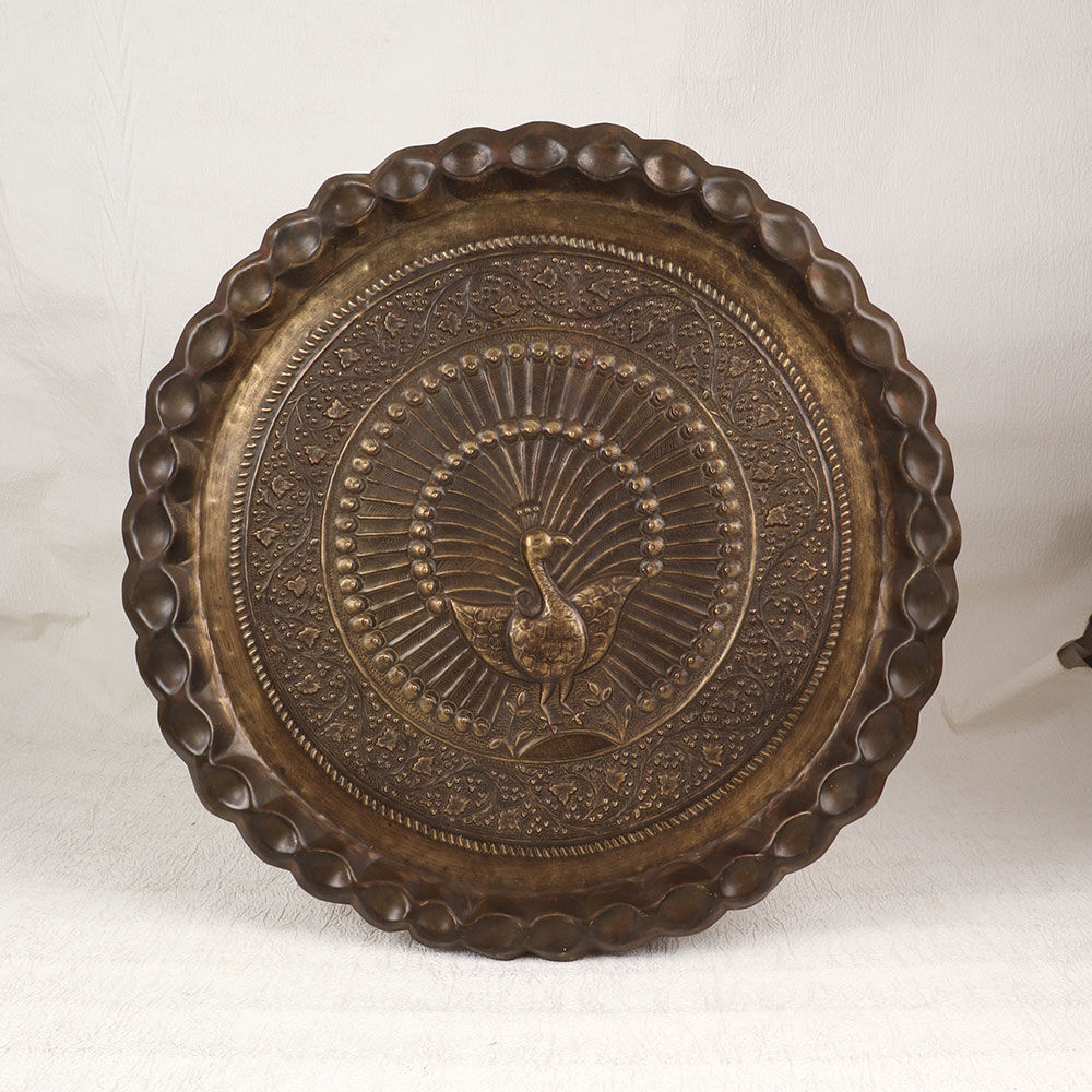 Catch eyes and compliments with the warm vintage elegance of this handcrafted brass peacock wall plate. Crafted from solid brass with intricate embossing across its surface, this wall hanging radiates old-world artistry and charm. The peacock makes a regal centerpiece, surrounded by graceful feathers, floral designs and an overall finish of antiquity in a rich burnished brown finish. At a generous 18 inches across, this brass wall plate truly dazzles and delights. Hang it proudly in an entryway to greet guests with its palpable vintage personality. Allow its impressive presence and ornate beauty to flourish as a decorative statement piece in your living room, bedroom or office as well. An instant heirloom, this peacock design wall hanging adds show stopping style with a resplendent splash of antiqued elegance!