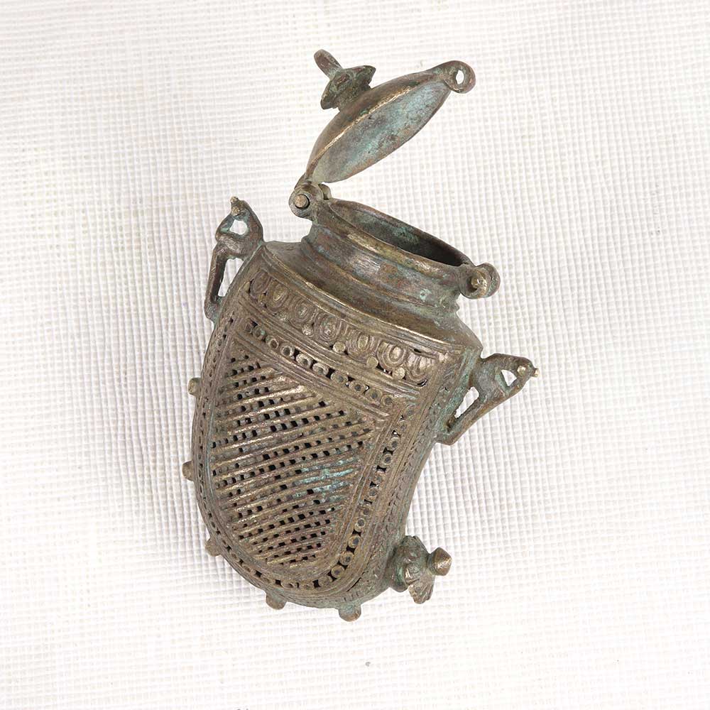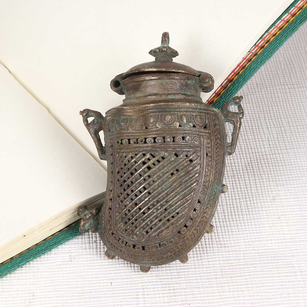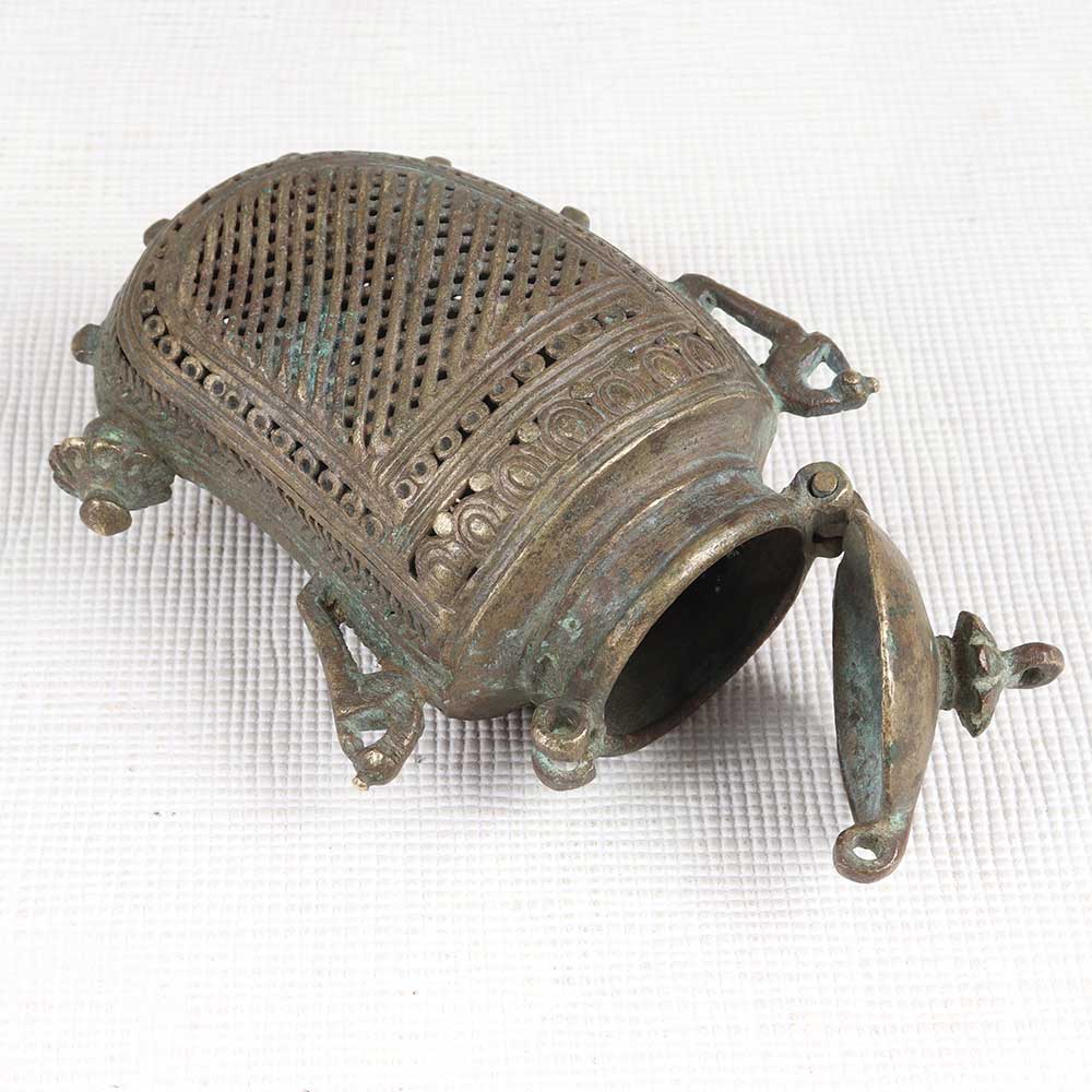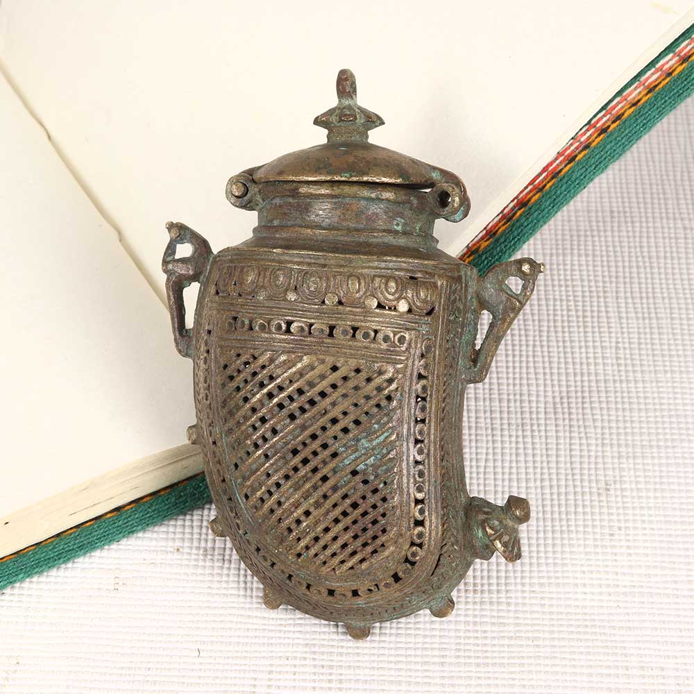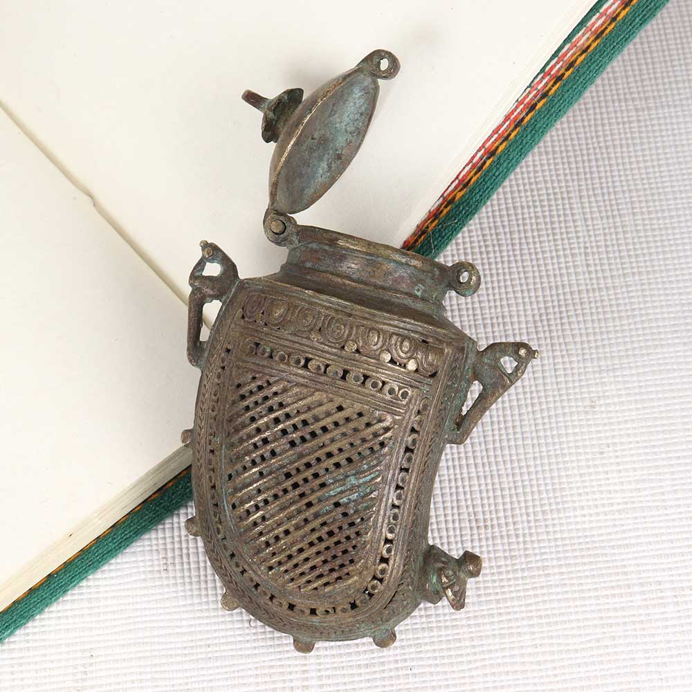 Bring a touch of tribal flair to your home with the brass tribal mango shape box. This stunning vintage box features intricate jali work in a mango motif, reminiscent of the tribal art and craftsmanship of India. This tribal-inspired box is perfect for anyone who wants to add an exotic, handcrafted accent to their home decor. The intricate jali cutout work evokes images of rural villages in India where artisans have been passing down these specialized metalworking techniques for generations. Display this box on a console table, bookshelf or coffee table to infuse your space with global style and artisanal appeal. For the free-spirited boho decorator or worldly, well-traveled friend, this tribal mango box makes a special gift. The vintage styling and handcrafted look reflect an appreciation for indigenous art from around the world.