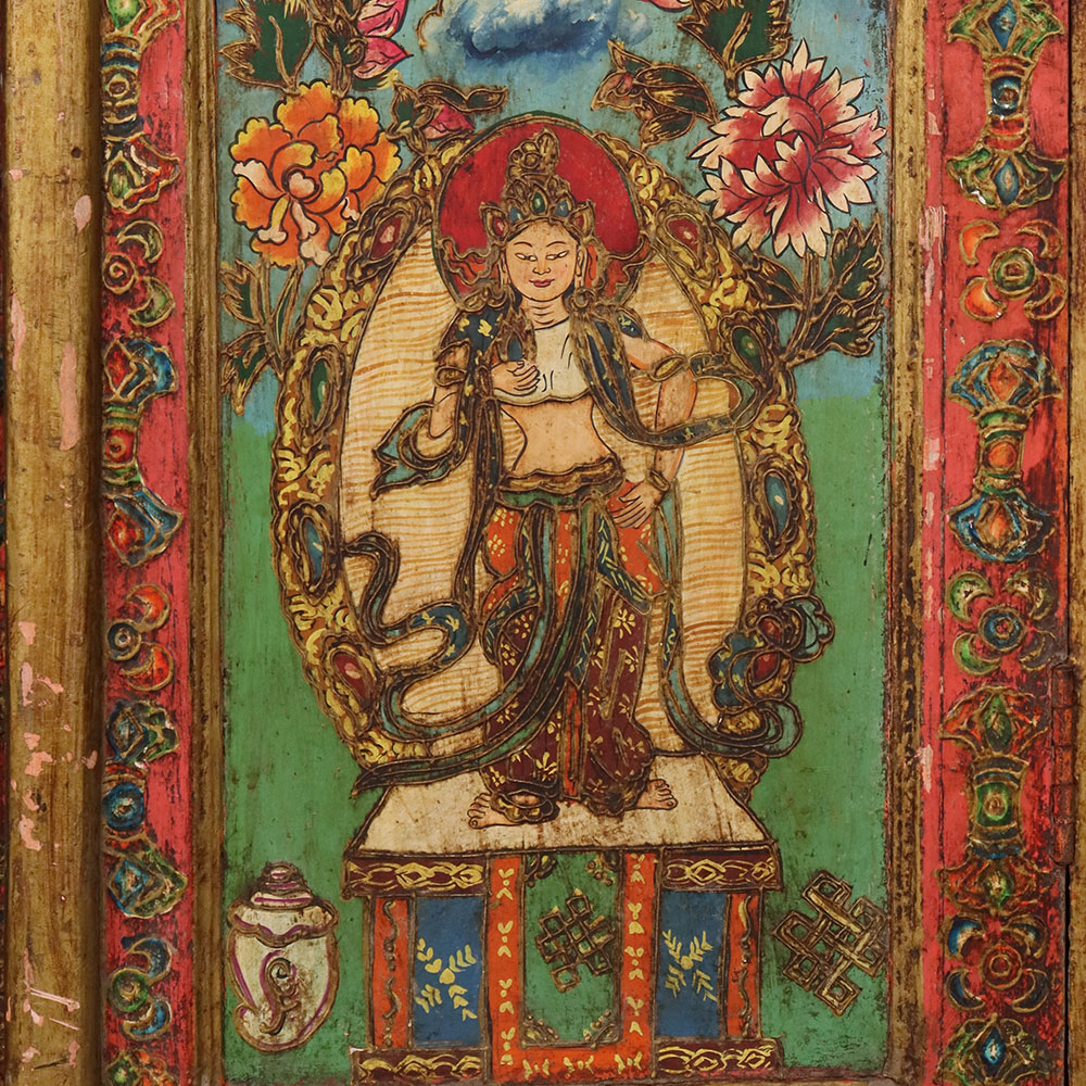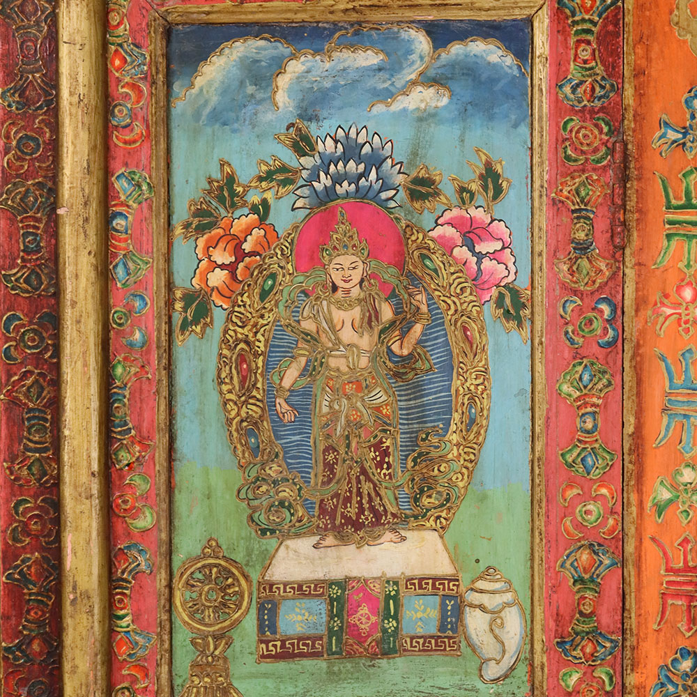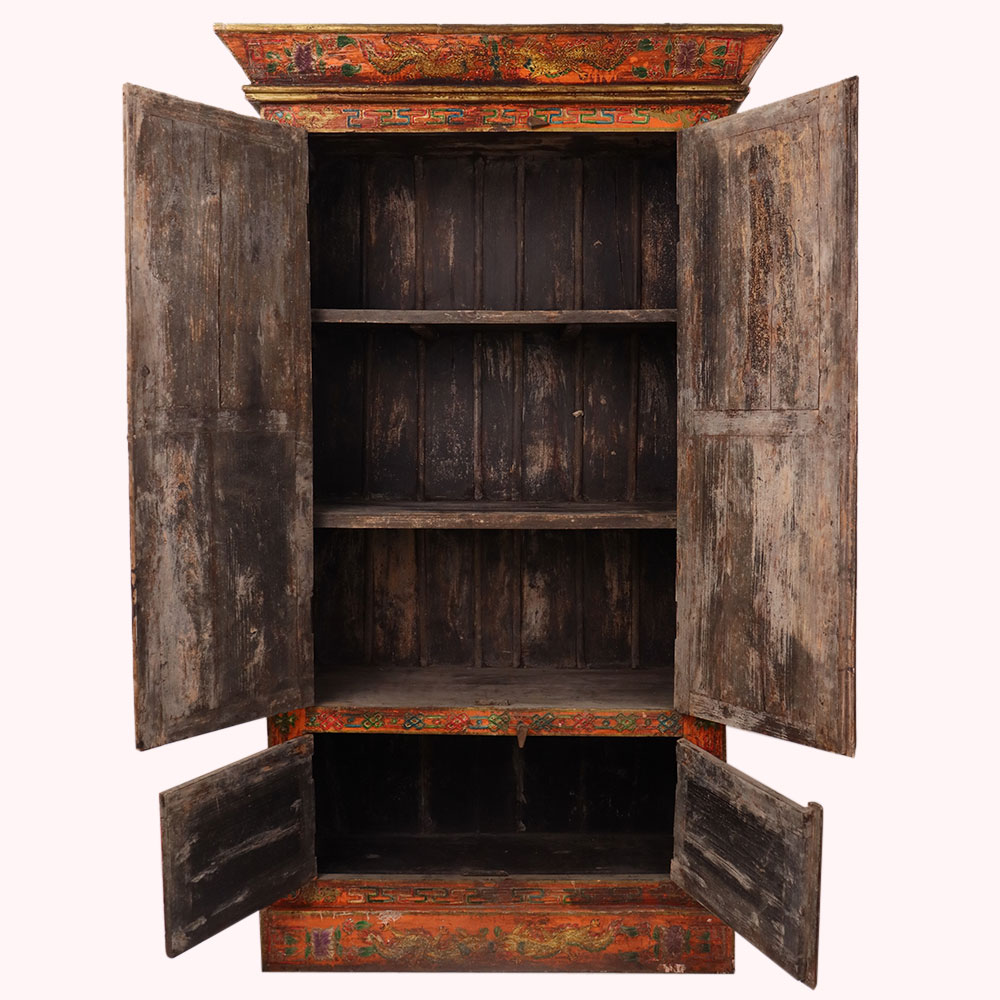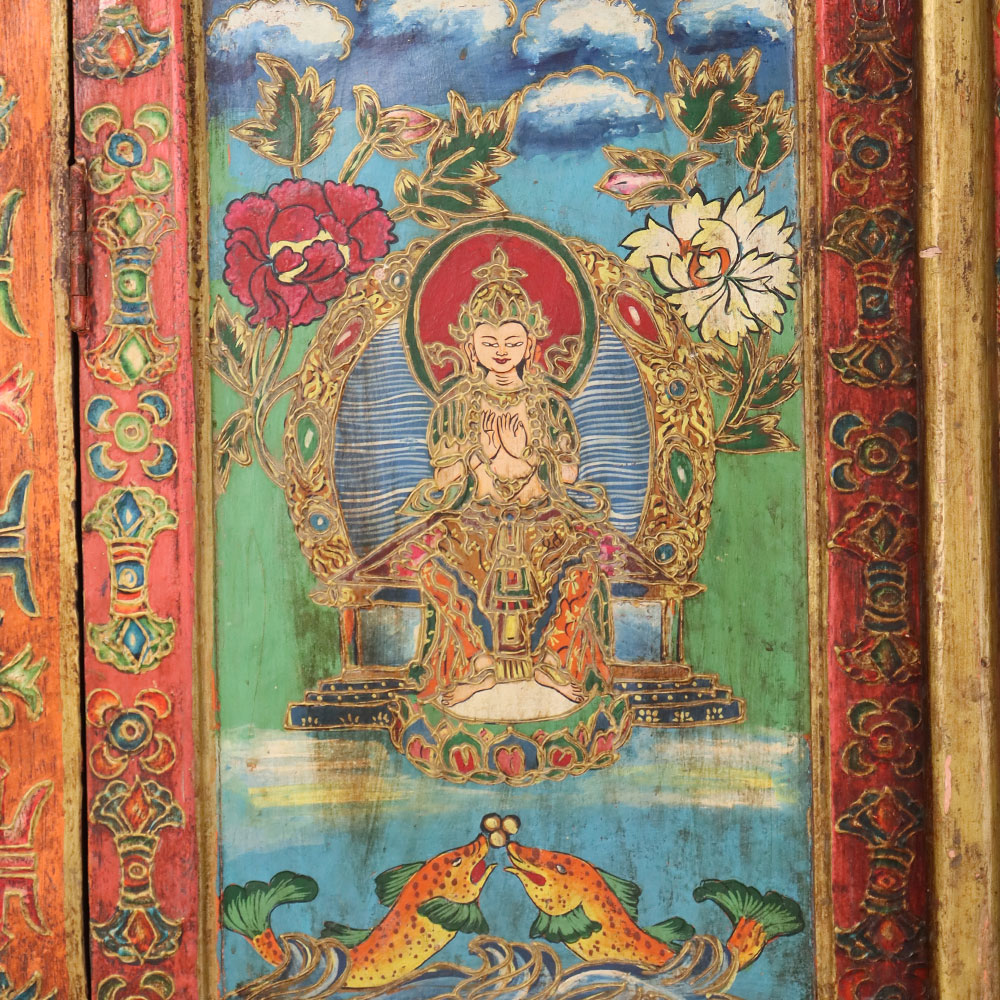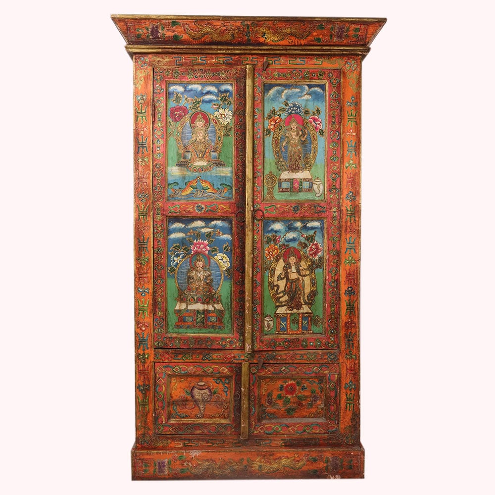 This handmade wooden almirah is a masterpiece of traditional artistry, beautifully decorated with hand-painted deity motifs framed by intricate floral and geometric borders. The rich tones of red, green, and gold enhance its antique-style finish, making it a striking blend of functionality and cultural heritage. With its tall structure and spacious design, this almirah is perfect for storing clothes, books, or sacred items, while also serving as a decorative centerpiece for heritage-inspired interiors. Each panel is meticulously painted by skilled artisans, ensuring every piece carries a unique charm and timeless appeal. Ideal for meditation spaces, living rooms, or as a collector’s piece, this wooden painted almirah is a perfect balance of storage, spirituality, and art.