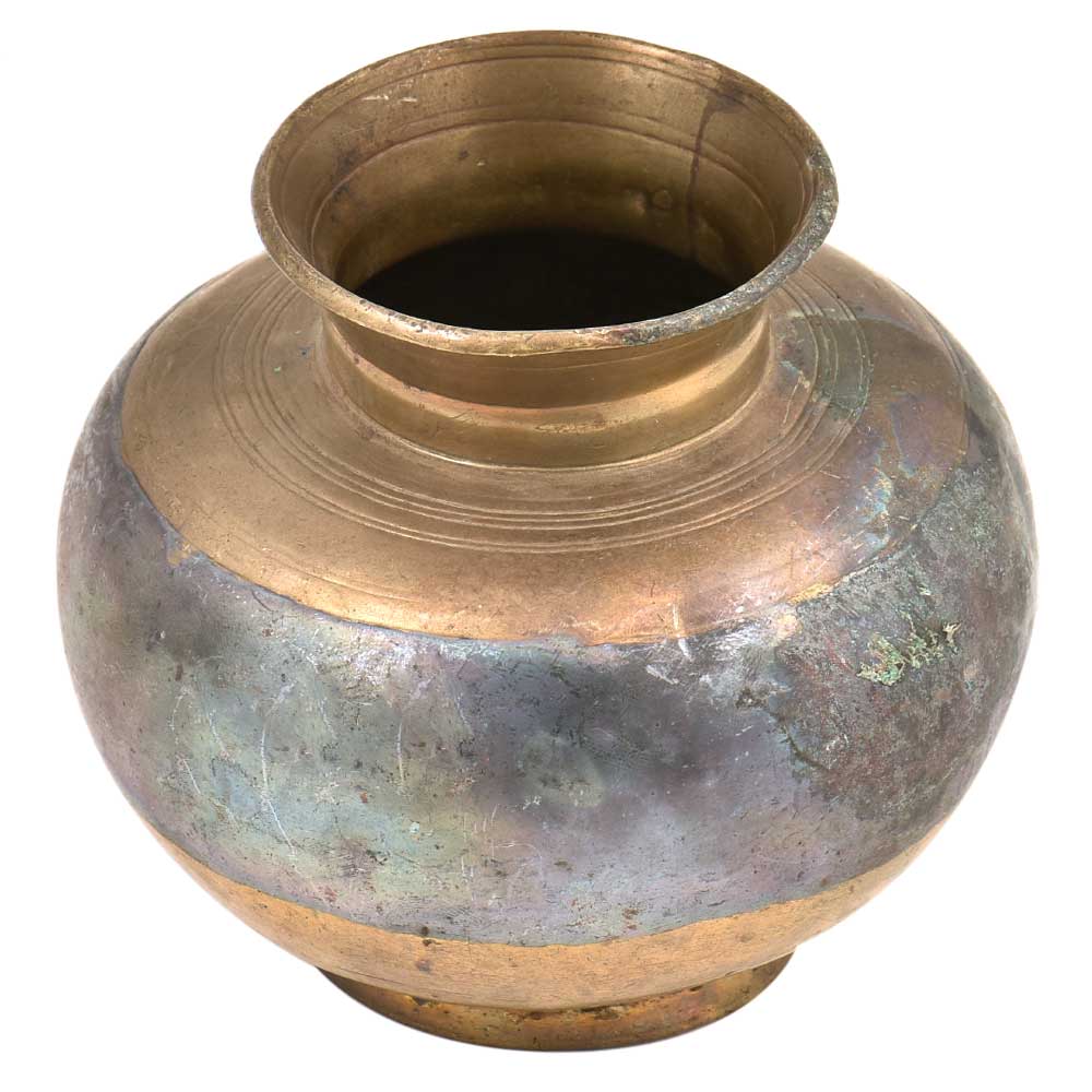 The pot with a heavy base is made of bronze and copper and called as ganga jamuna pot and it is handmade by the skilled craftsmen of India. This pot is beautifully engraved and it can be used for gifting or for traditional use.