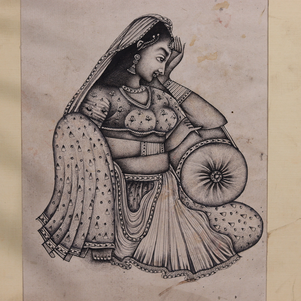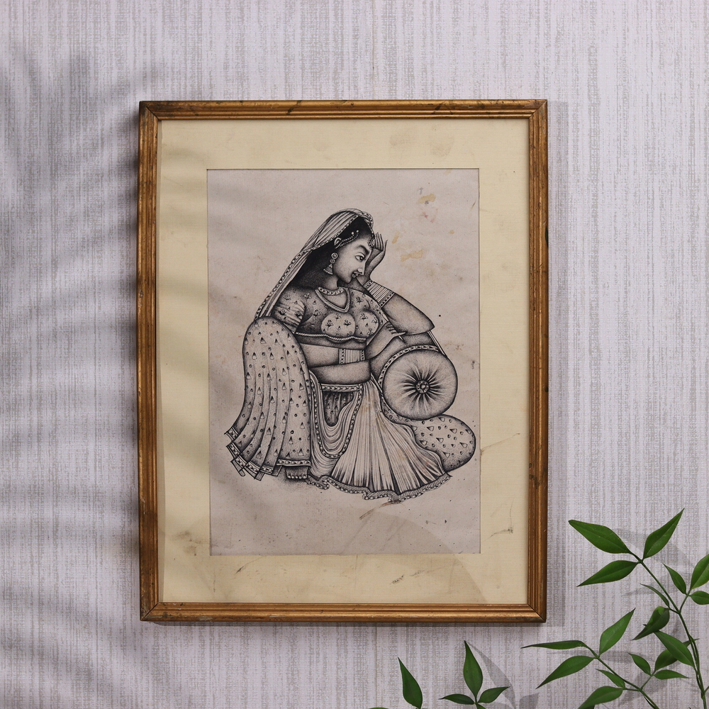 Step back in time with this captivating Vintage traditional Art Indian sitting lady painting. Masterfully rendered in pencil, this stunning work of art transports you to the heart of India, showcasing the timeless elegance and cultural richness of a bygone era. This breathtaking painting is a true masterpiece, celebrating the beauty and artistry of India's cultural heritage. The skilled artist has meticulously captured the intricate folds of the woman's vibrant clothing, the gleam of her ornate jewelry, and the serene expression on her face. Every stroke of the pencil brings this vintage scene to life, inviting you to immerse yourself in the timeless charm of traditional Indian art. Whether you're a collector of fine art or simply appreciate the captivating beauty of Indian culture, this Vintage traditional Art Indian sitting lady painting is a must-have addition to your home or office. Hang it in a prominent spot and let it transport you to a world of elegance, tradition, and artistic excellence.