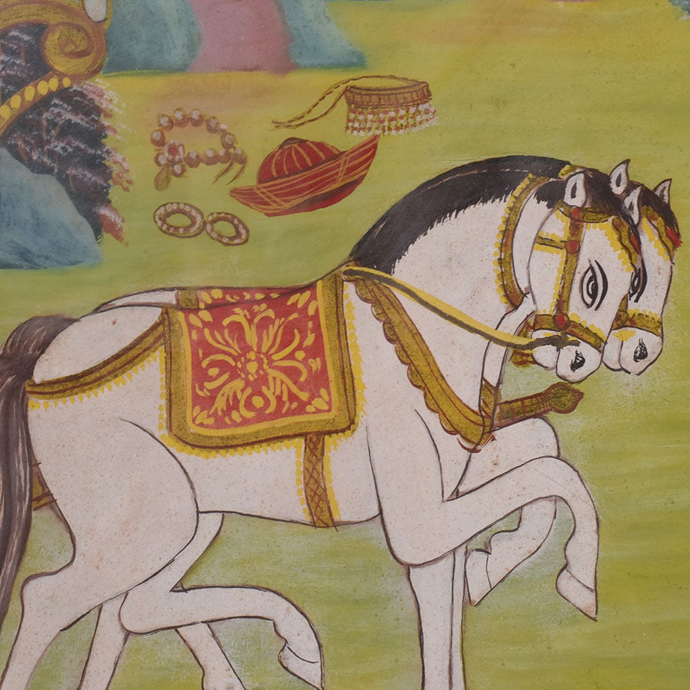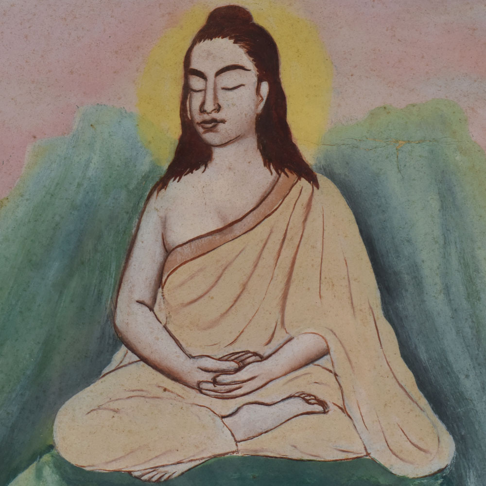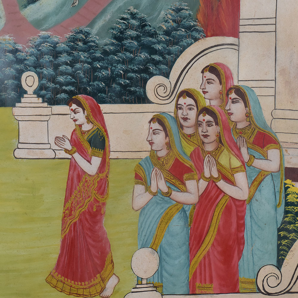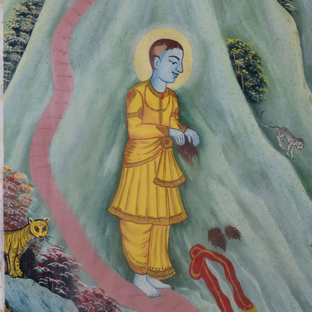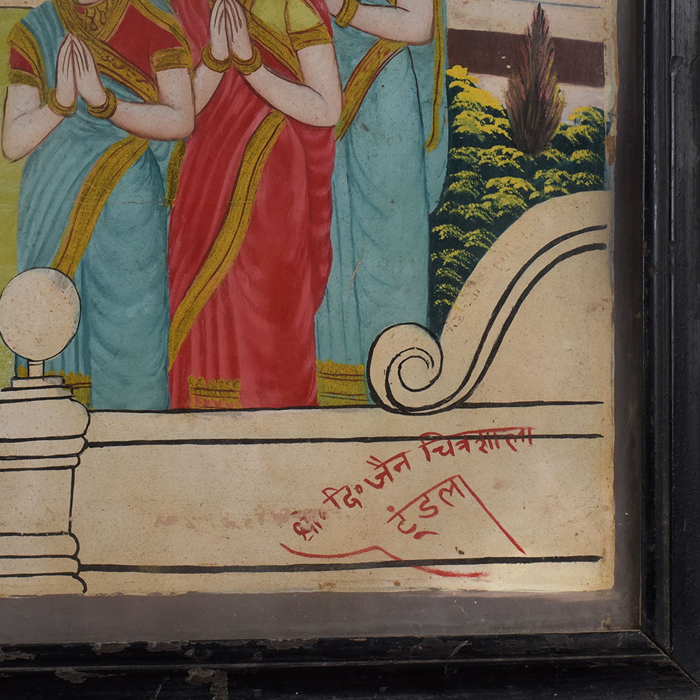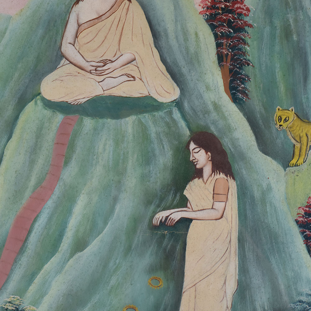 This traditional paper painting on Jain subject beautifully illustrates the spiritual journey of Jain Tirthankaras, created with delicate watercolors. The artwork portrays ascetics, devotees, and divine figures amidst lush green mountains, capturing the deep symbolism and philosophy of Jainism. Each element in the painting reflects devotion, renunciation, and enlightenment, making it a valuable representation of Jain heritage and teachings. With its vibrant palette and intricate detailing, this painting serves as both a devotional piece and a collectible for lovers of Indian religious art. Its vintage charm and cultural depth make it ideal for display in homes, temples, and galleries, enhancing the space with serenity and historical value.