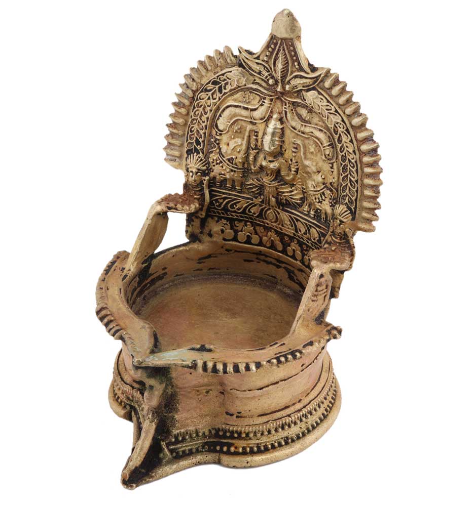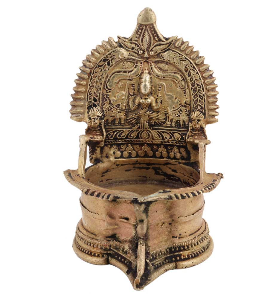 Brass oil lamp with goddess laxmi and two elephants engraved with an oil and ghee container and lighten up your home , hotel, spa interiors. Diwali gift, new year gift, anniversary gift for your near and dear ones.