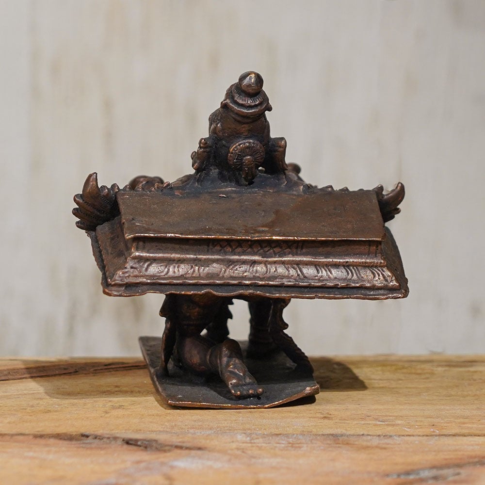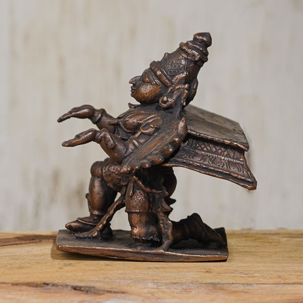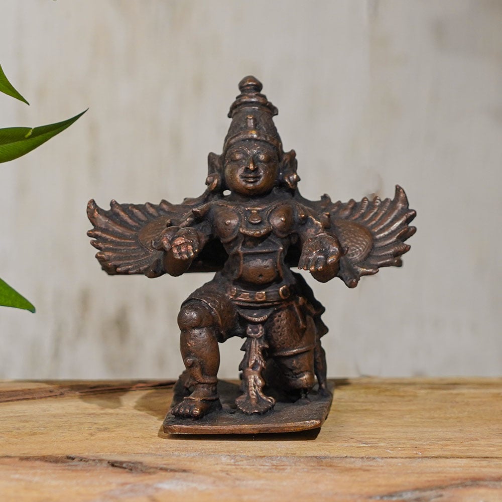 An exquisite copper statue that features Lord Garuda, the revered mythical bird and vehicle of Lord Vishnu, meticulously handcrafted by skilled Indian artisans with intricate details. Lord Garuda is widely worshipped in many Indian temples and revered as a symbol of courage, wisdom, and divine protection. This Lord Garuda murti is a stunning representation of the majestic bird with its wings spread wide, showcasing the craftsmanship and artistic skill of the Indian artisans. The intricate details and fine craftsmanship make it a remarkable piece of art that can be used for worship in your home temple, enhancing your spiritual practice and invoking the blessings of Lord Garuda. In addition to its spiritual significance, this Lord Garuda statue also serves as an elegant decorative piece for your home or office. Its unique design and cultural significance make it a perfect addition to your home decor, adding a touch of spiritual ambiance to your surroundings. You can buy this exquisite Lord Garuda statue online and add it to your collection of divine artefacts, or gift it to your loved ones on special occasions as a token of reverence and blessings.