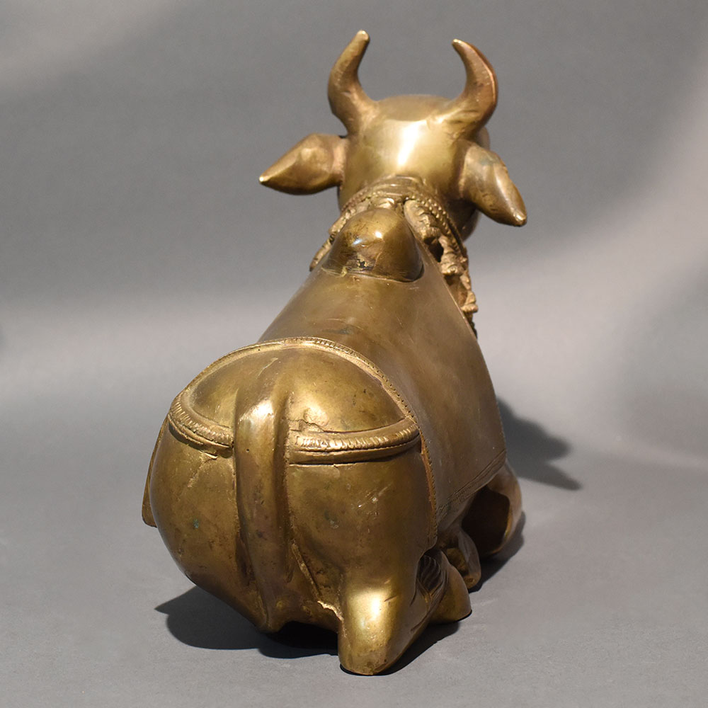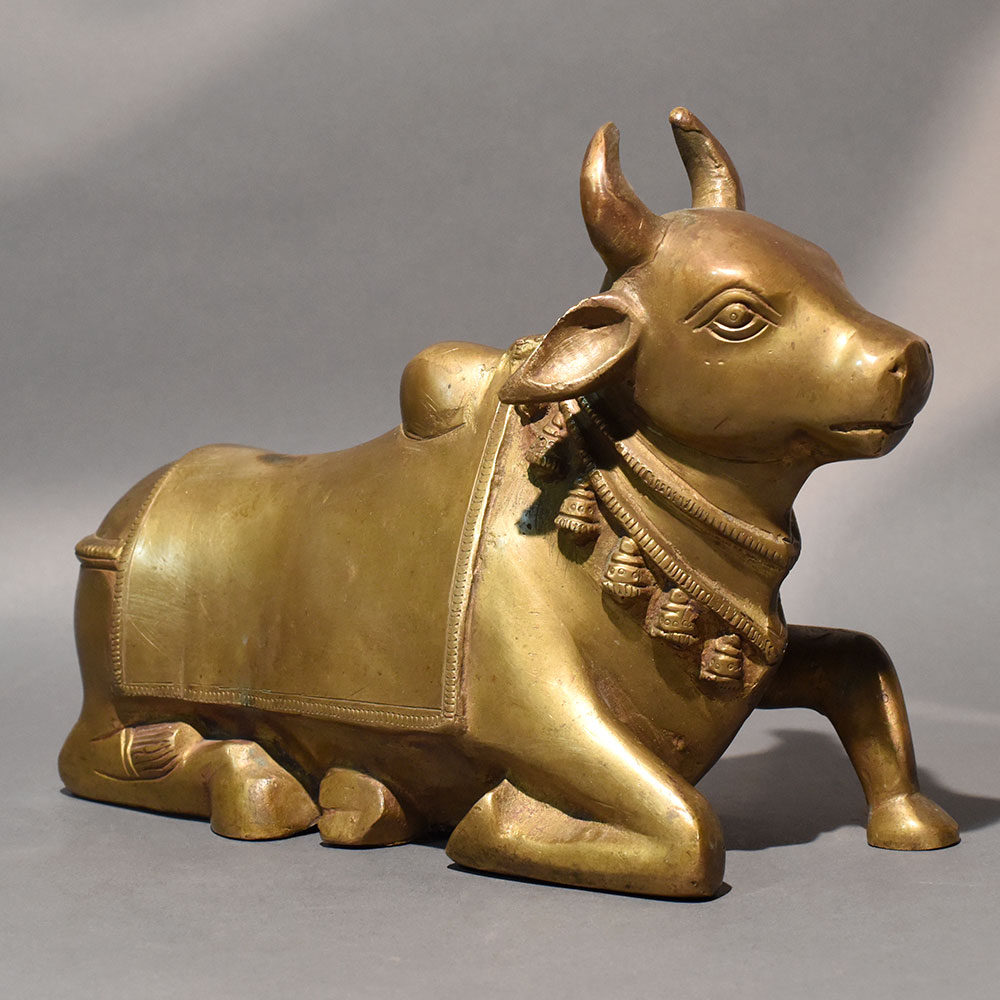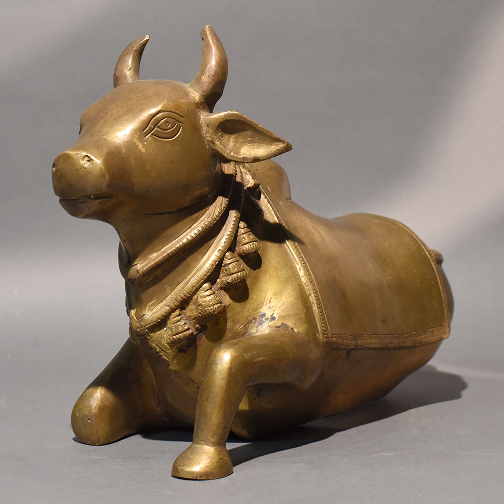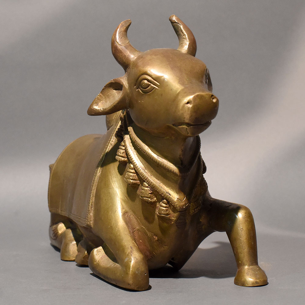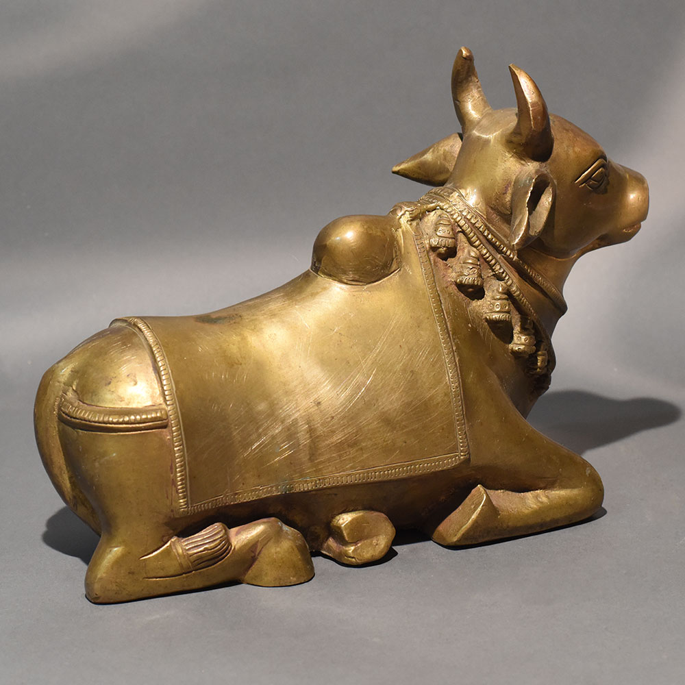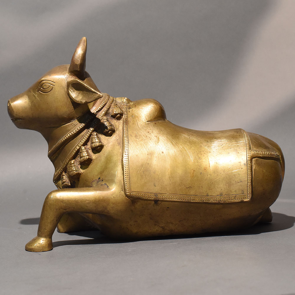 This traditional Nandi bull statue handcrafted in solid brass reflects devotion, strength, and spiritual elegance through its refined sculptural form. Designed in a reclining posture with gracefully folded legs and a slightly lifted head, the figure radiates calm authority and sacred presence. The smooth contours and balanced proportions give it a timeless aesthetic suitable for both devotional and decorative settings. The sculpture features a classic temple-inspired design, including a sculpted ornamental cloth draped across the back and a detailed necklace with hanging bell motifs around the neck. The serene facial expression and gently curved horns enhance its dignified appearance. Finished in a warm antique gold tone, the surface carries subtle variations that highlight its handcrafted authenticity. Created using traditional casting techniques, this handcrafted brass Nandi idol embodies cultural symbolism rooted in Hindu tradition. Nandi, the sacred vehicle of Lord Shiva, represents loyalty, faith, and unwavering devotion. This statue is ideal for placement in pooja rooms, temple spaces, meditation corners, or as a spiritually meaningful accent in living areas. Its horizontal design makes it well-suited for altar platforms, shelves, or display cabinets. The durable brass construction ensures longevity and maintains its sheen over time, while minor tonal variations make each piece uniquely expressive.