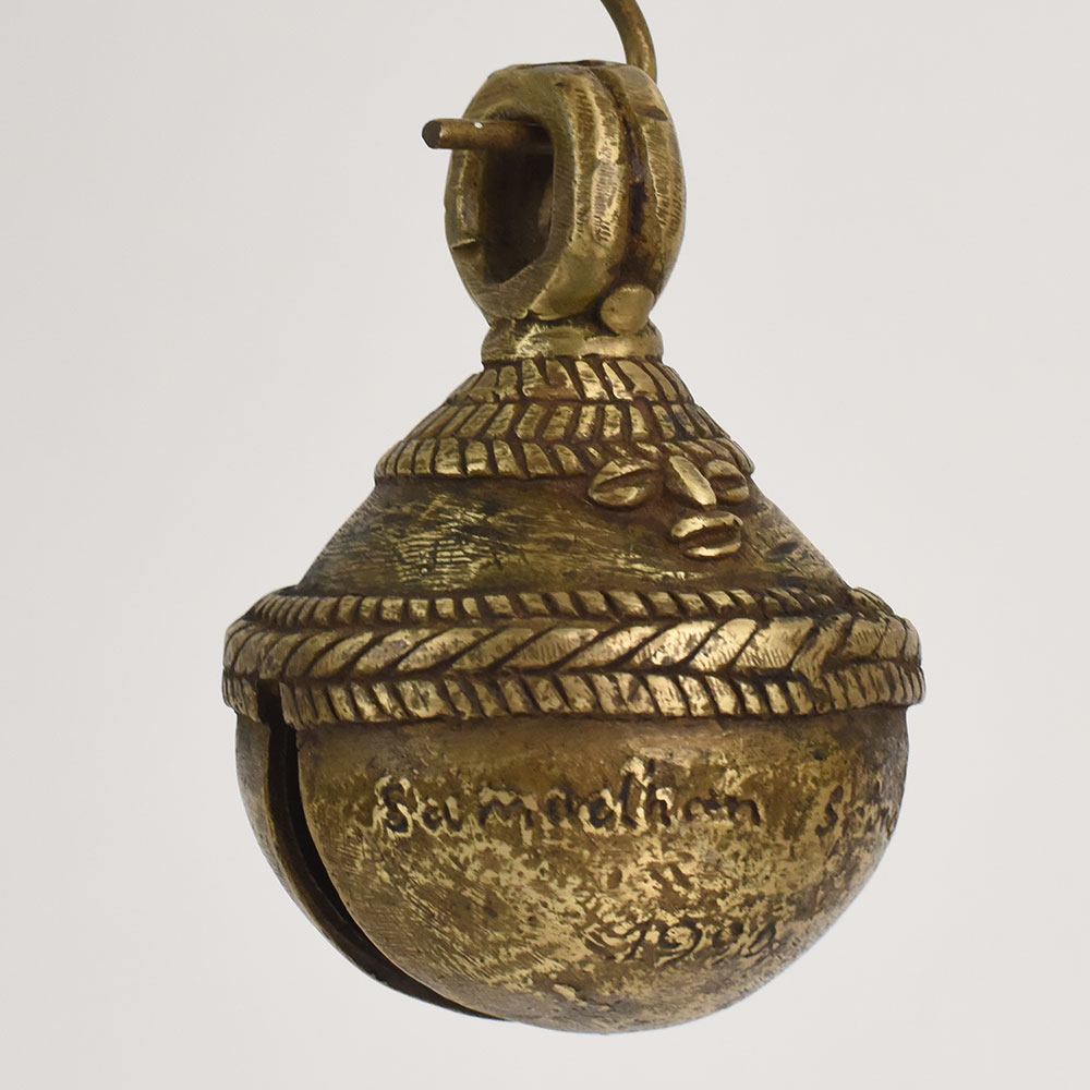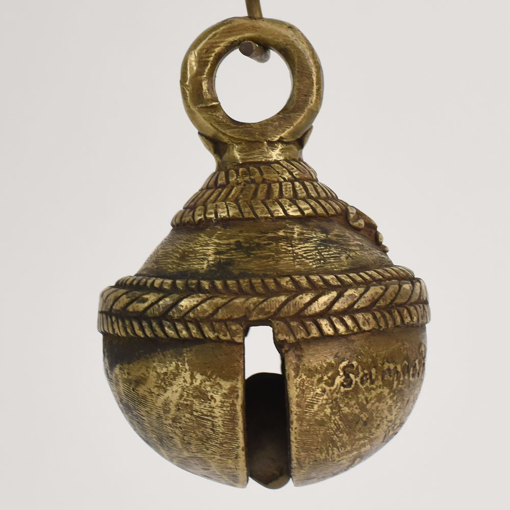 This traditional vintage cow bell from Northern India embodies centuries-old metalworking techniques and rural heritage. Crafted from bell metal, it has developed a richly toned patina featuring golden bronze hues interspersed with darker textured areas. Its signature rounded base and handcrafted looped handle reveal the skill of local artisans who shaped functional everyday tools with artistic sensibility. Today it serves as a charming dcor statement, perfect for rustic, artisanal, and culturally inspired interiors. Use it in entryway dcor, wall displays, or craft projects for a touch of authenticity. Its organic imperfections and aged appearance make it a treasured collectible object.