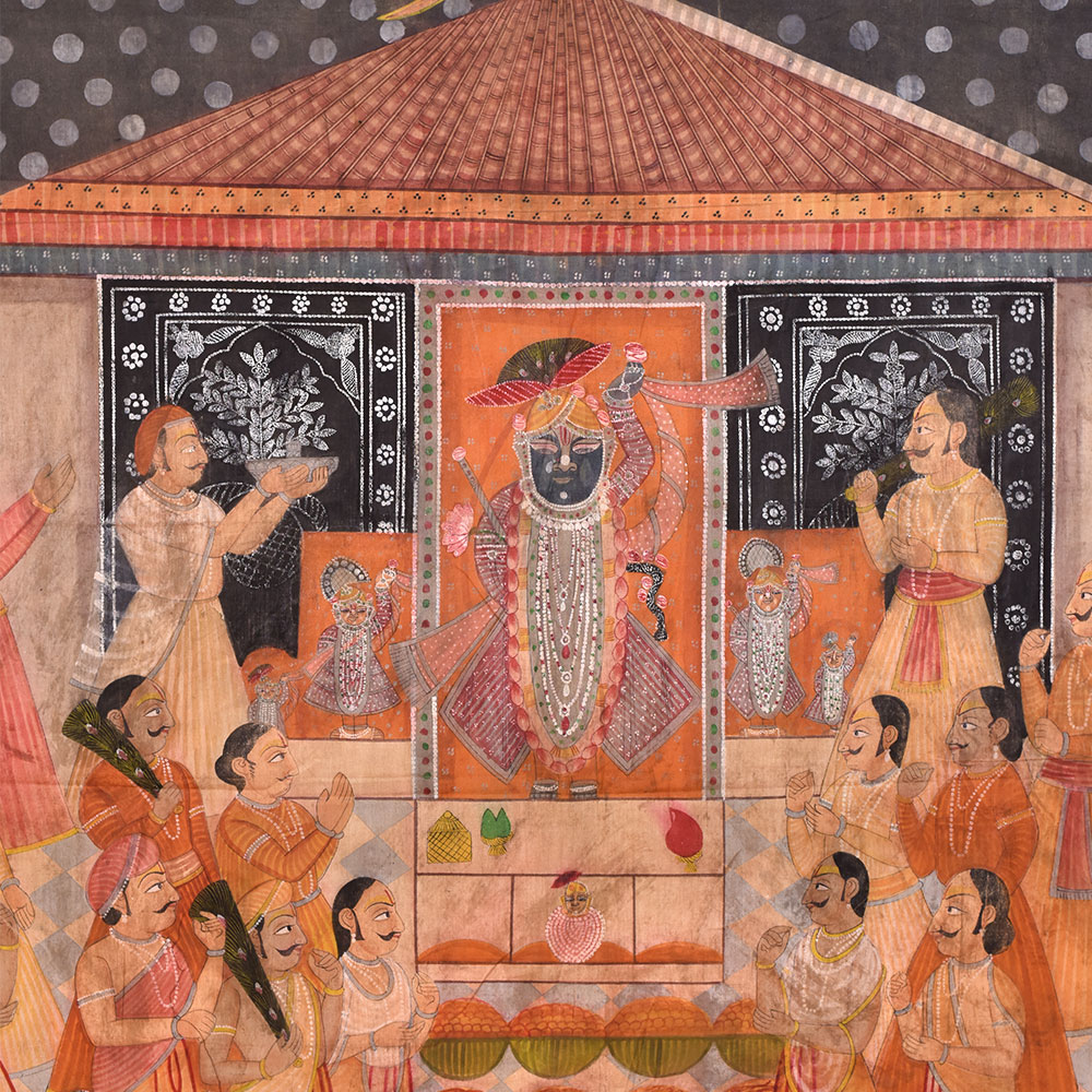This magnificent Pichwai painting on fabric cloth depicts a serene Hindu temple dedicated to a powerful deity. The painting is an exquisite piece of art, intricately designed by professional Indian artists who have skillfully captured the essence of the Hindu temple's grandeur and the devotion of the many devotees who come to pray. The painting is filled with vibrant multi-colours, adding to the overall appeal of the piece. The temple is the centrepiece of the painting, with intricately painted, giving the viewer a sense of awe and reverence. The devotees, who are praying with folded hands, add a sense of spirituality and dedication to the artwork. Adding to the charm of the painting, four swan vehicles are depicted in the sky. This beautiful Pichwai painting on fabric cloth is perfect to adorn your prayer room or a temple and adds a touch of spirituality to your space. It is also an ideal gift for your loved ones on special or festive occasions, a thoughtful way to show them that you care about their spiritual journey.