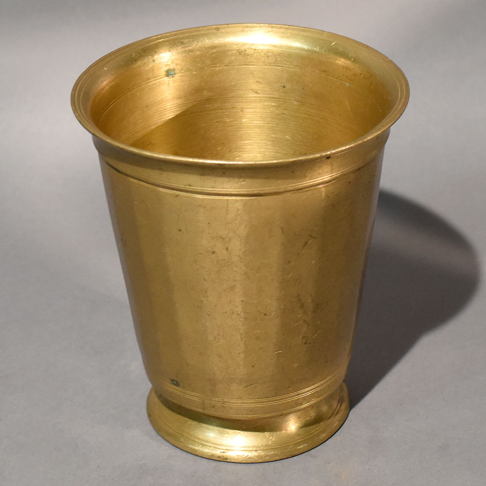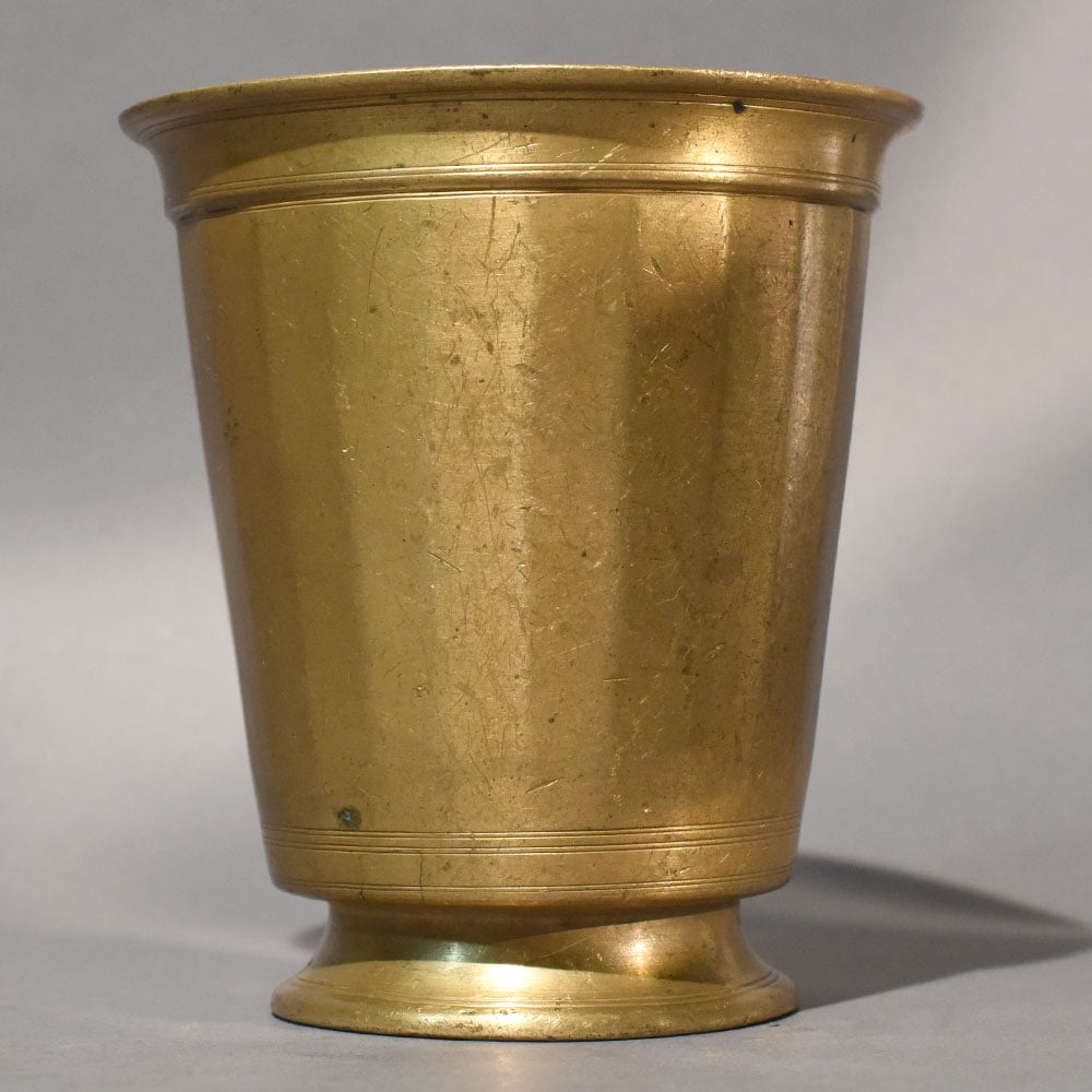 This traditional pedestal brass pooja tumbler reflects enduring ritual design shaped for simplicity and strength. The vessel features a broad outward-curving rim that transitions into a gently tapered cylindrical body, creating a balanced silhouette. It stands securely on a rounded pedestal base that elevates the form while ensuring stable placement during ceremonies. The surface displays a warm golden brass tone enriched with natural aging marks, fine scratches, and subtle patina that highlight its handcrafted authenticity. Delicate horizontal line accents encircle the upper and lower body, adding restrained detailing without disturbing the clean structure. The understated design makes it suitable for both devotional and heritage Decor settings. The interior is smoothly finished, making it appropriate for sacred water, milk, panchamrit, or other ritual offerings. Brass vessels are traditionally valued in temples and Indian households for their durability and symbolic purity. This tumbler integrates effortlessly into daily pooja practices, festive rituals, and altar arrangements. Its sturdy pedestal base provides elevation and ceremonial prominence while maintaining functional balance. Crafted from solid brass using traditional shaping methods, it offers long-term usability and structural reliability. Over time, the surface naturally develops a richer tone, enhancing its antique appeal.