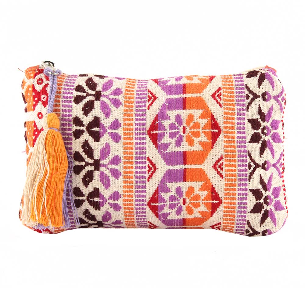 Traditional Pink Pattern Zip Top Jaquard Cotton Clutch bag With Tassle